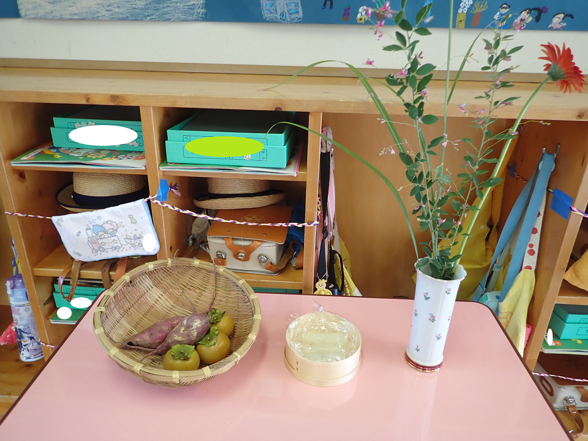 ススキに萩・お月見会団子と幼稚園で収穫した野菜をお供えしてお月見会の始まり始まり!
