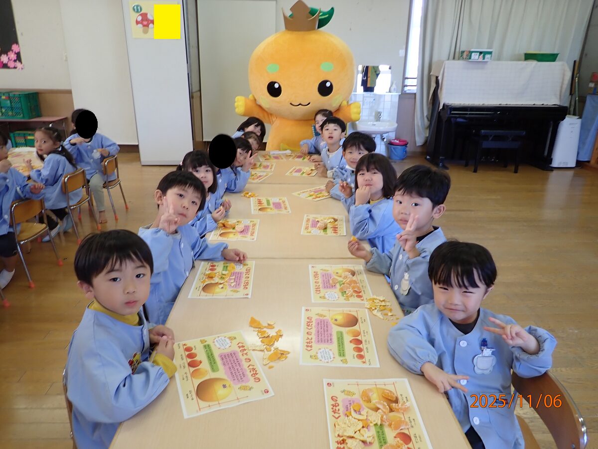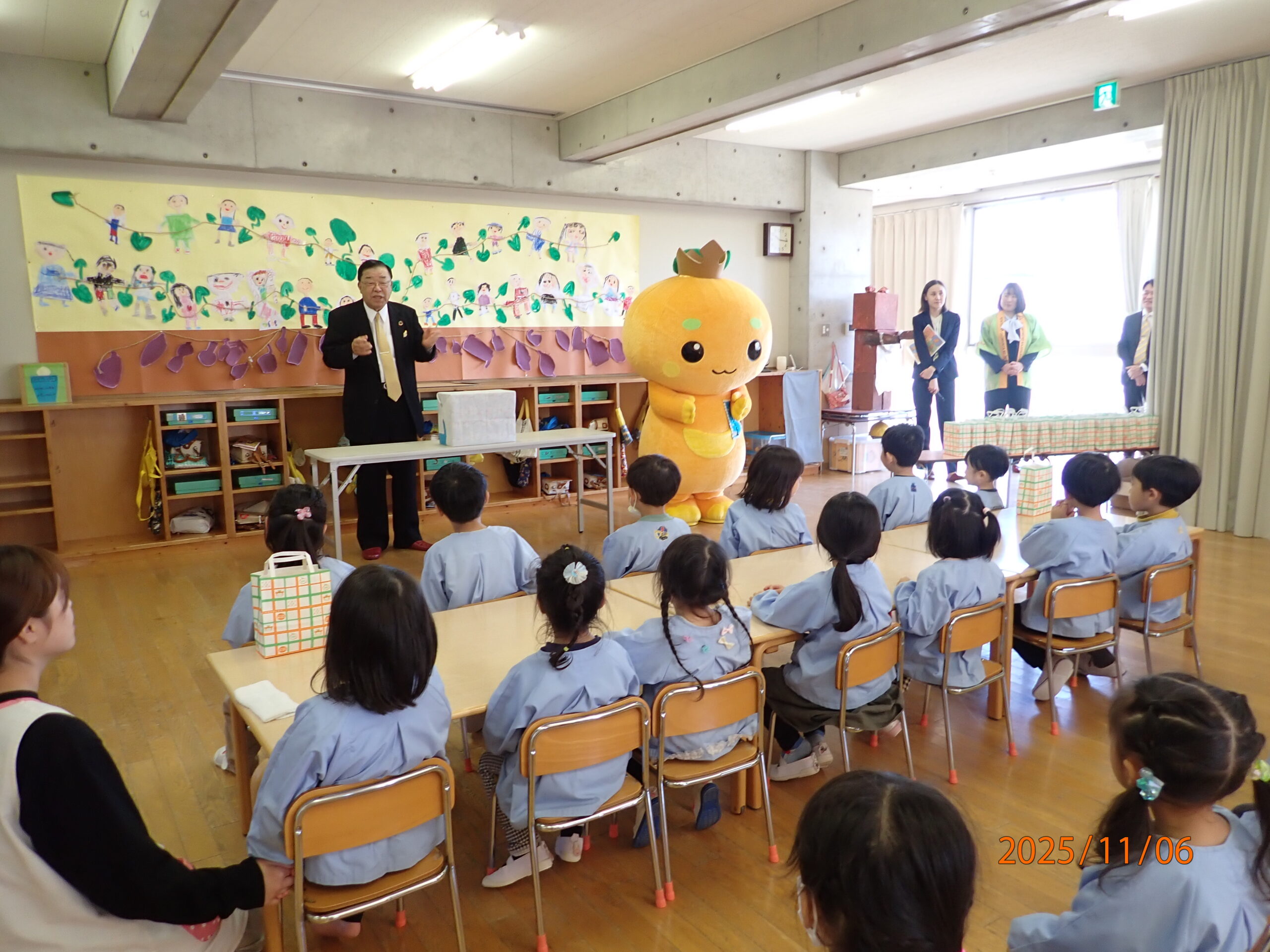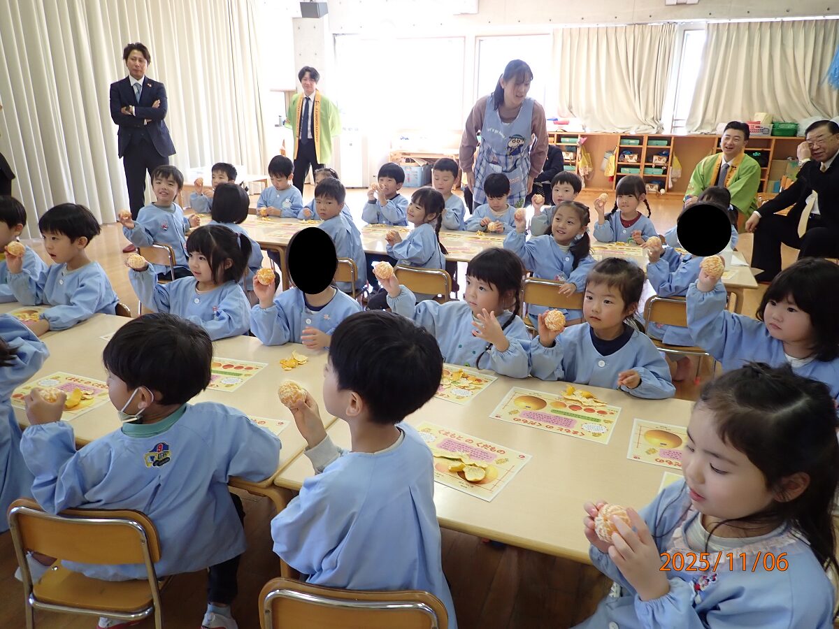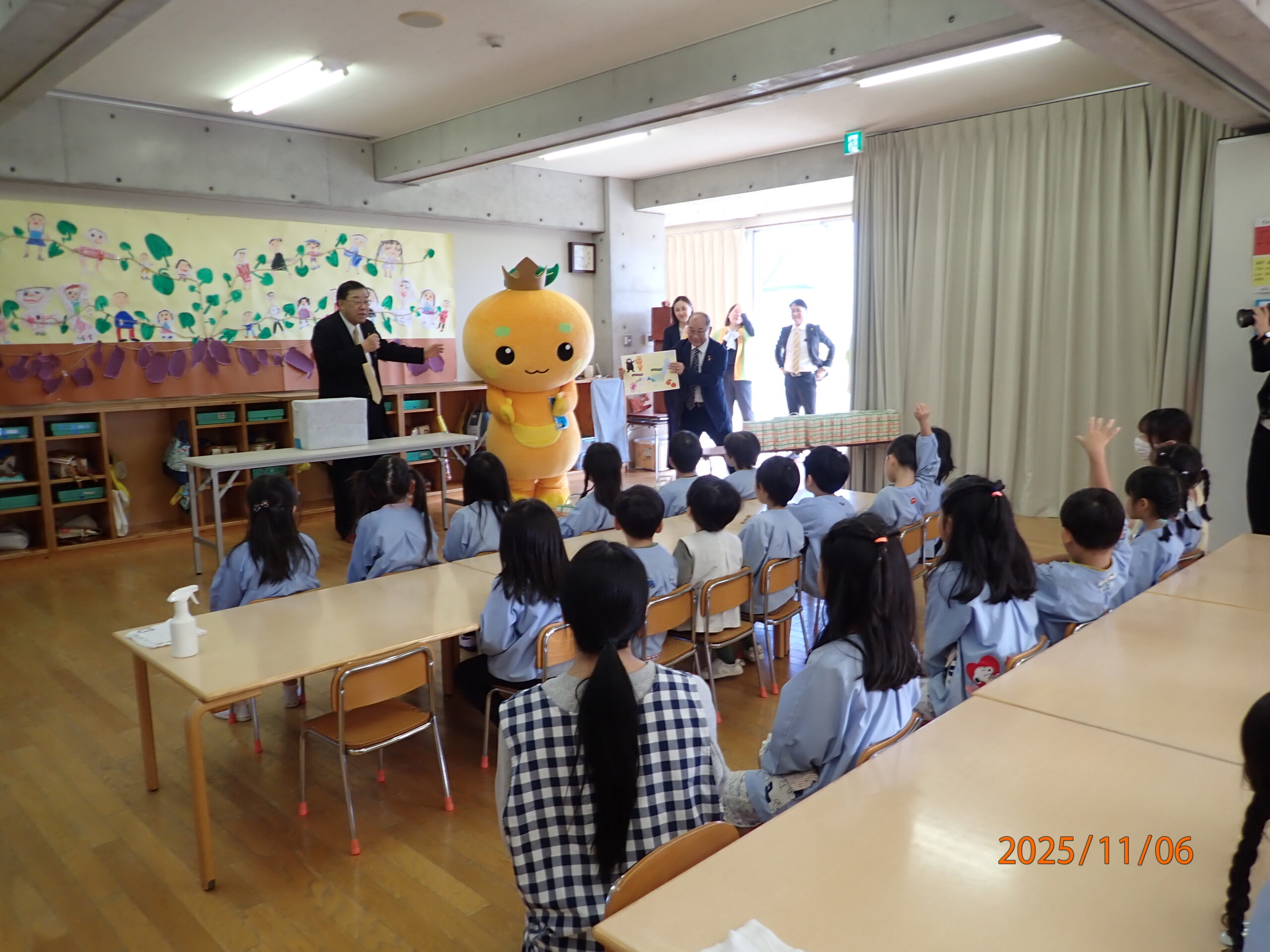 次は年中組がお話を聞きます。保育室に入ると「何だかいい匂いがする!」と早速みかんの匂いに気づいた子どもたち。