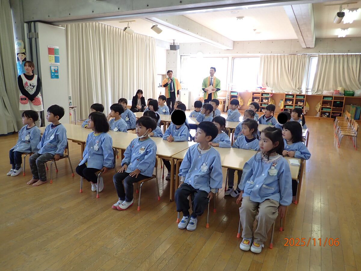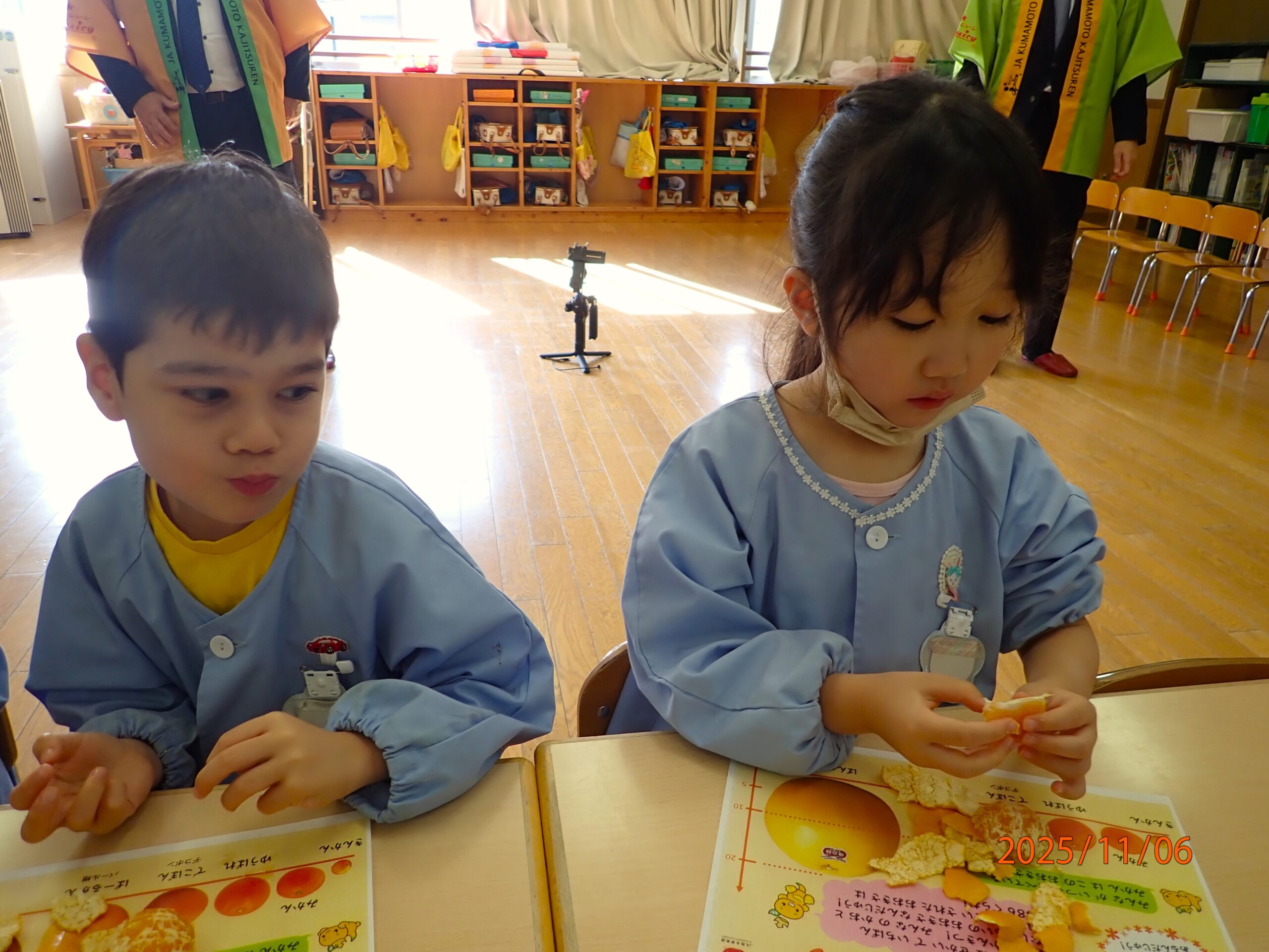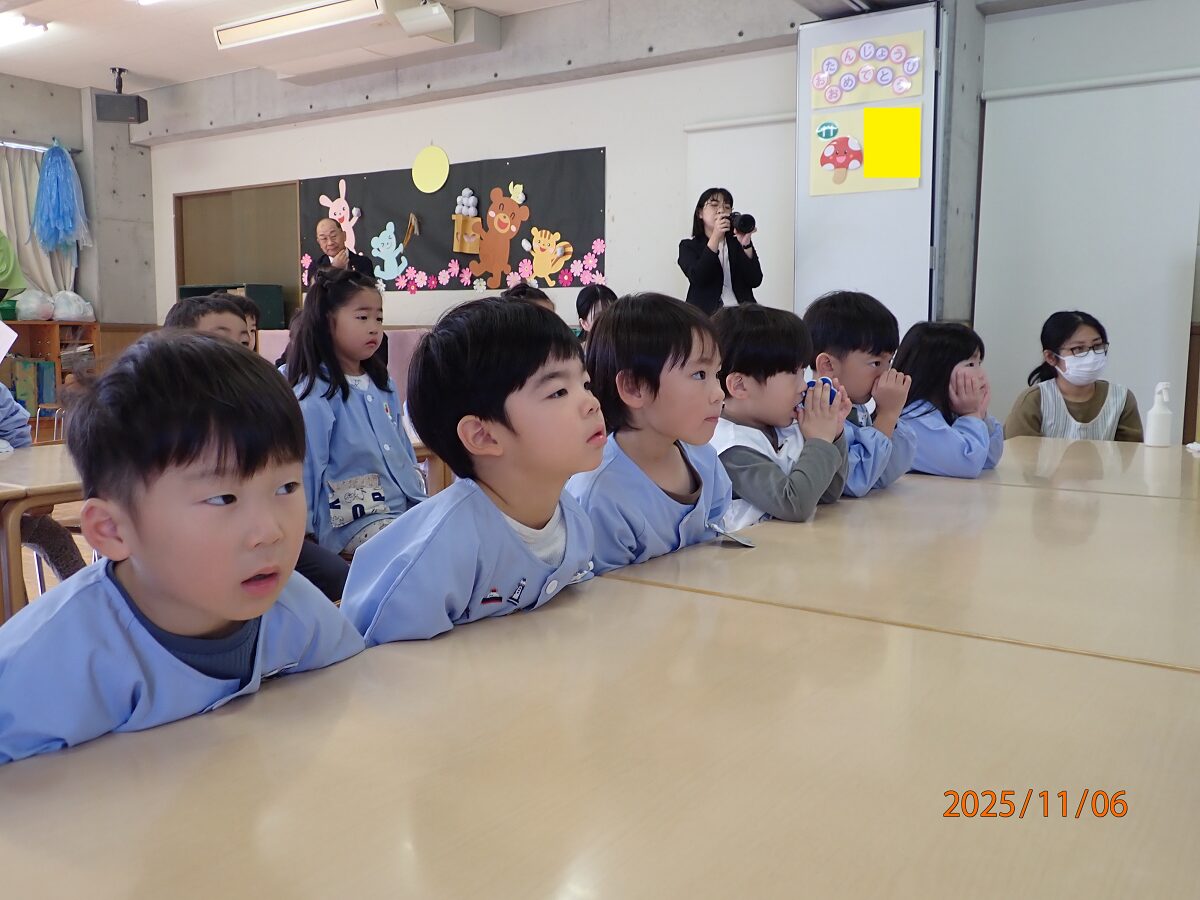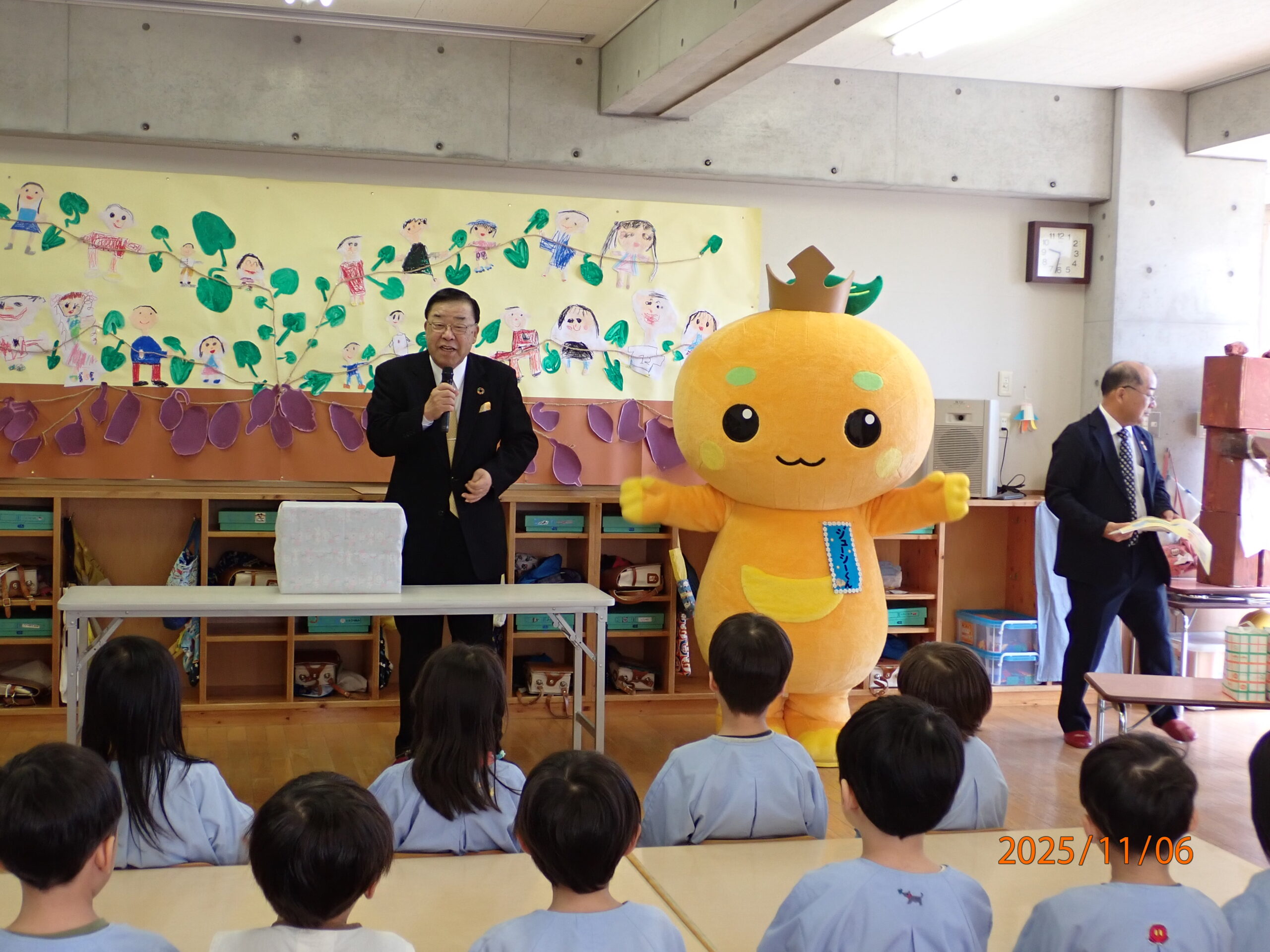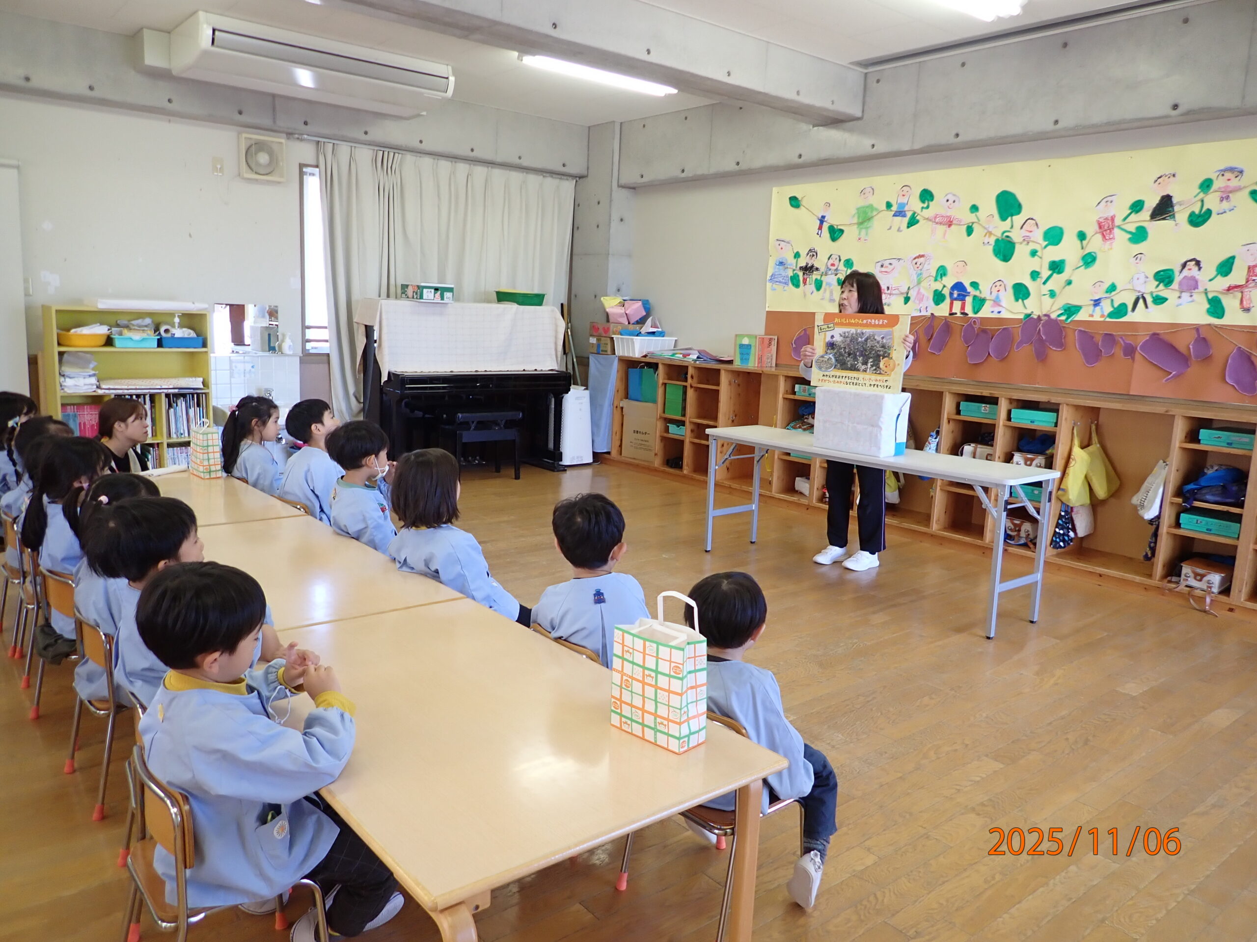 次は年中組がお話を聞きます。保育室に入ると「何だかいい匂いがする!」と早速みかんの匂いに気づいた子どもたち。