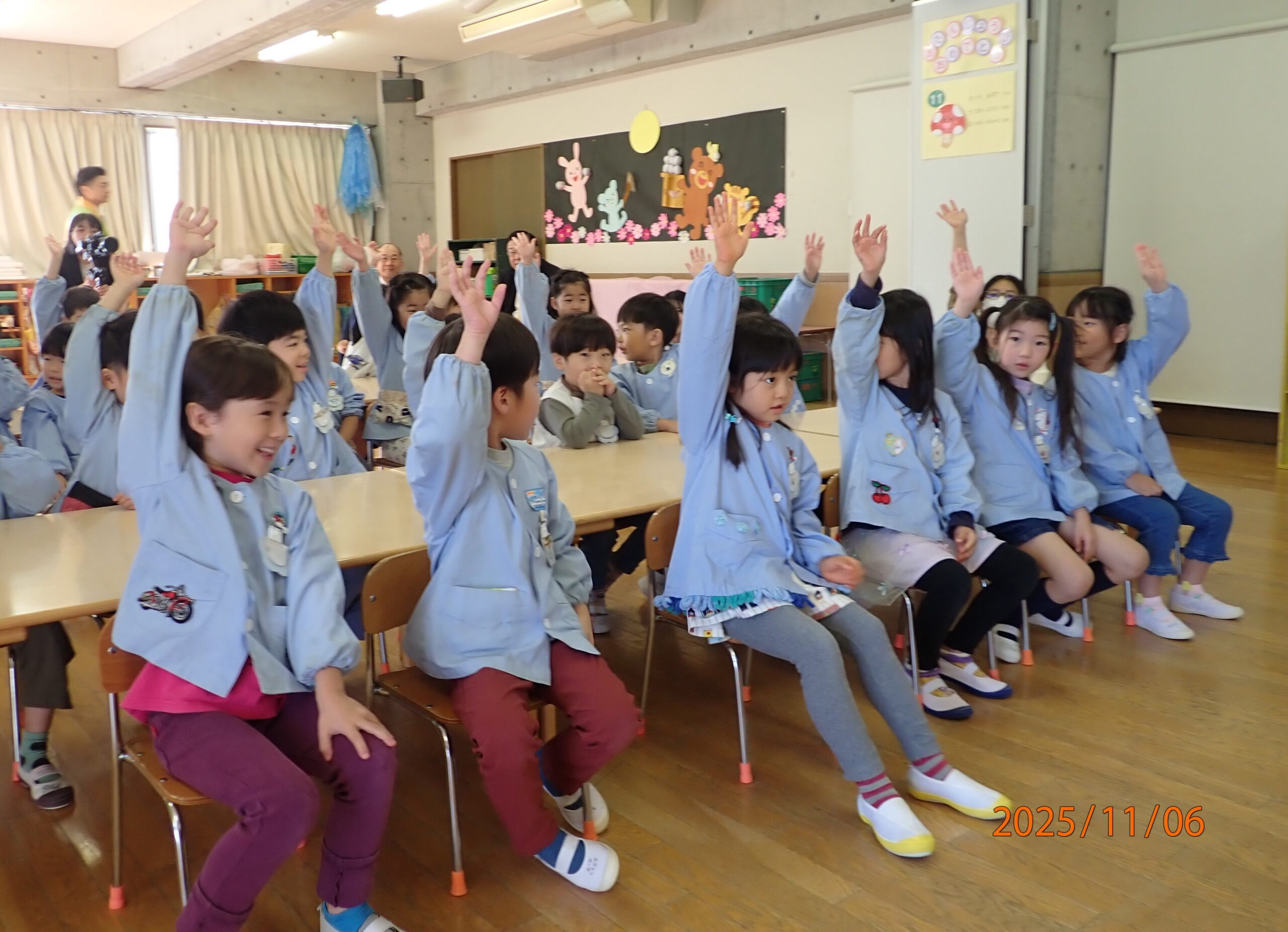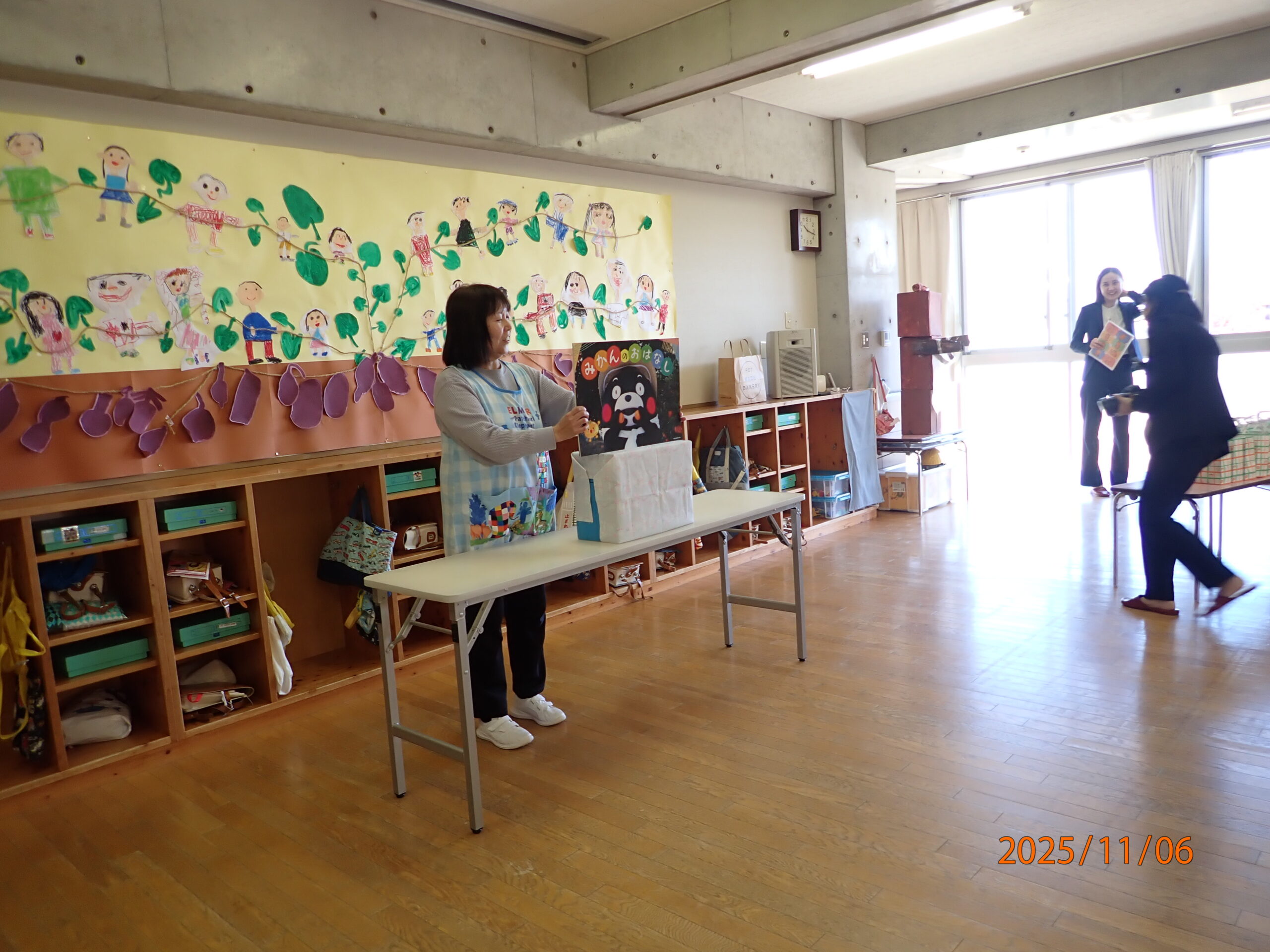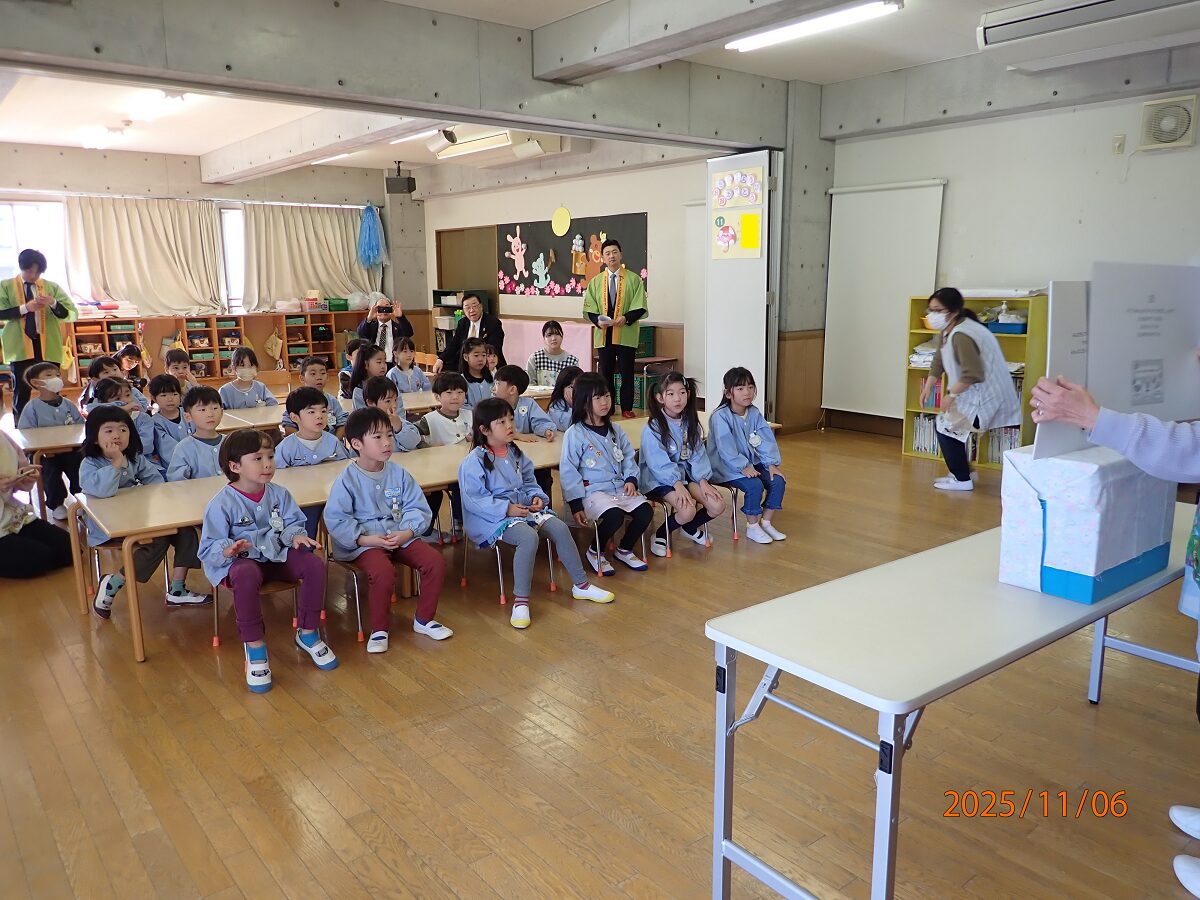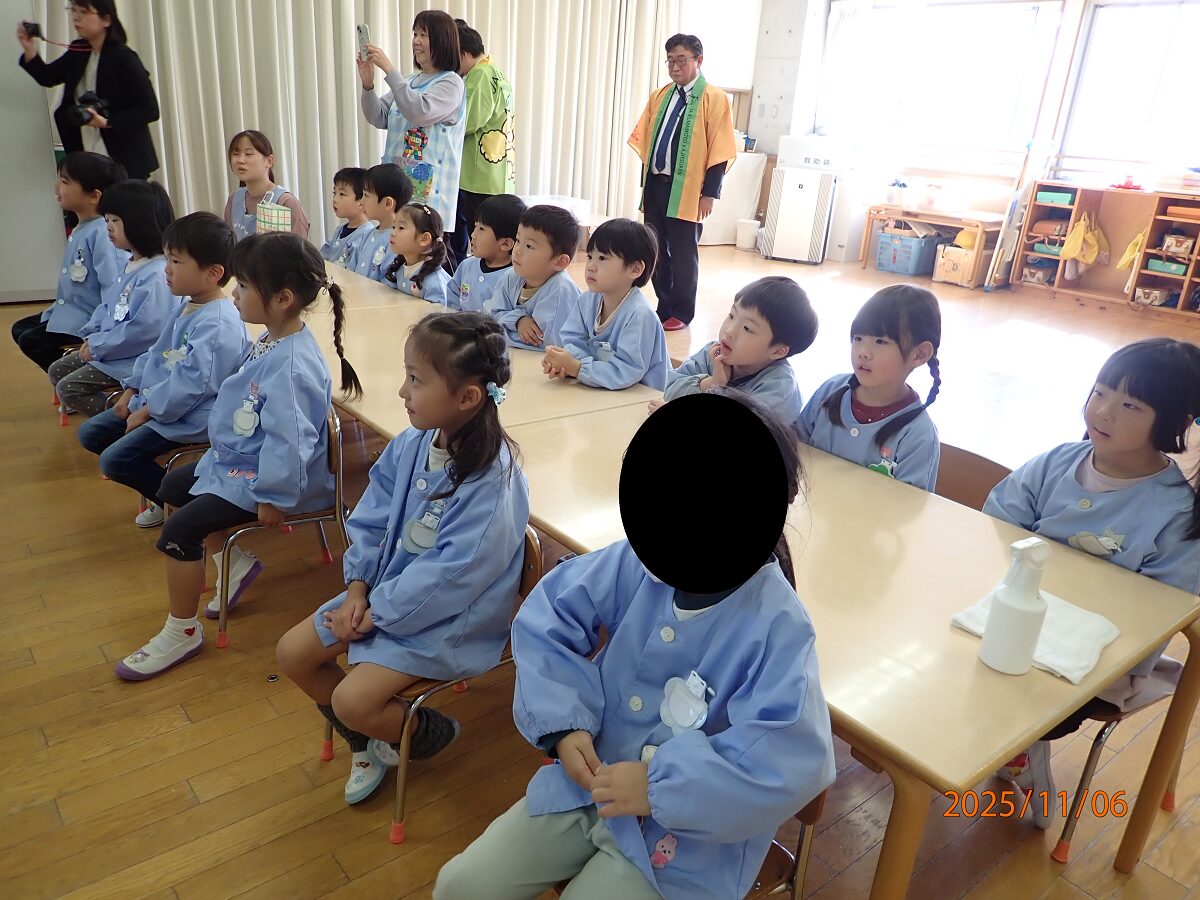次は年中組がお話を聞きます。保育室に入ると「何だかいい匂いがする!」と早速みかんの匂いに気づいた子どもたち。