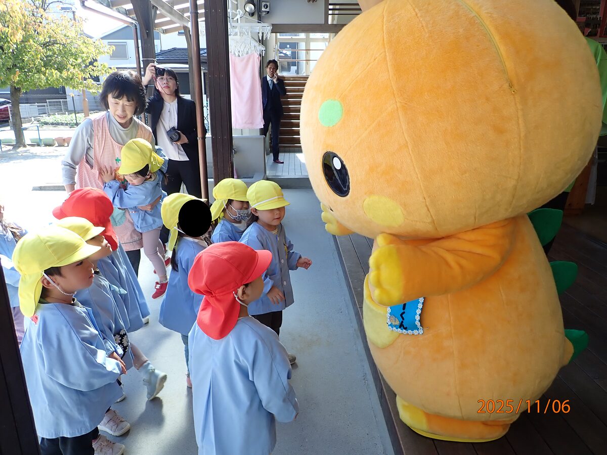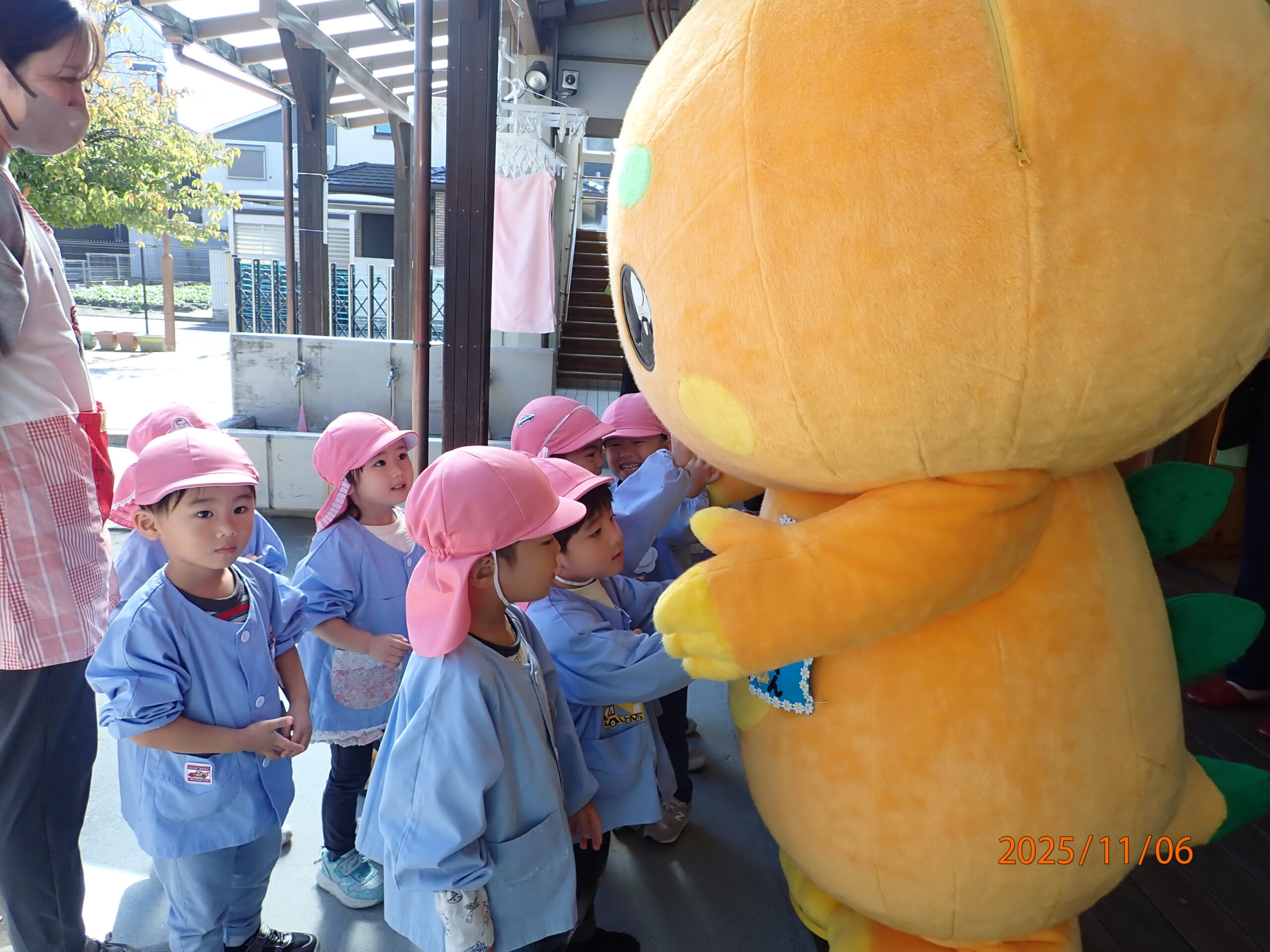 ジューシー君はこの後1階のテラスに来てくれて、年少組やひよこ組の子どもたちも触れ合うことが出来ました。ジューシー君ありがとうね。