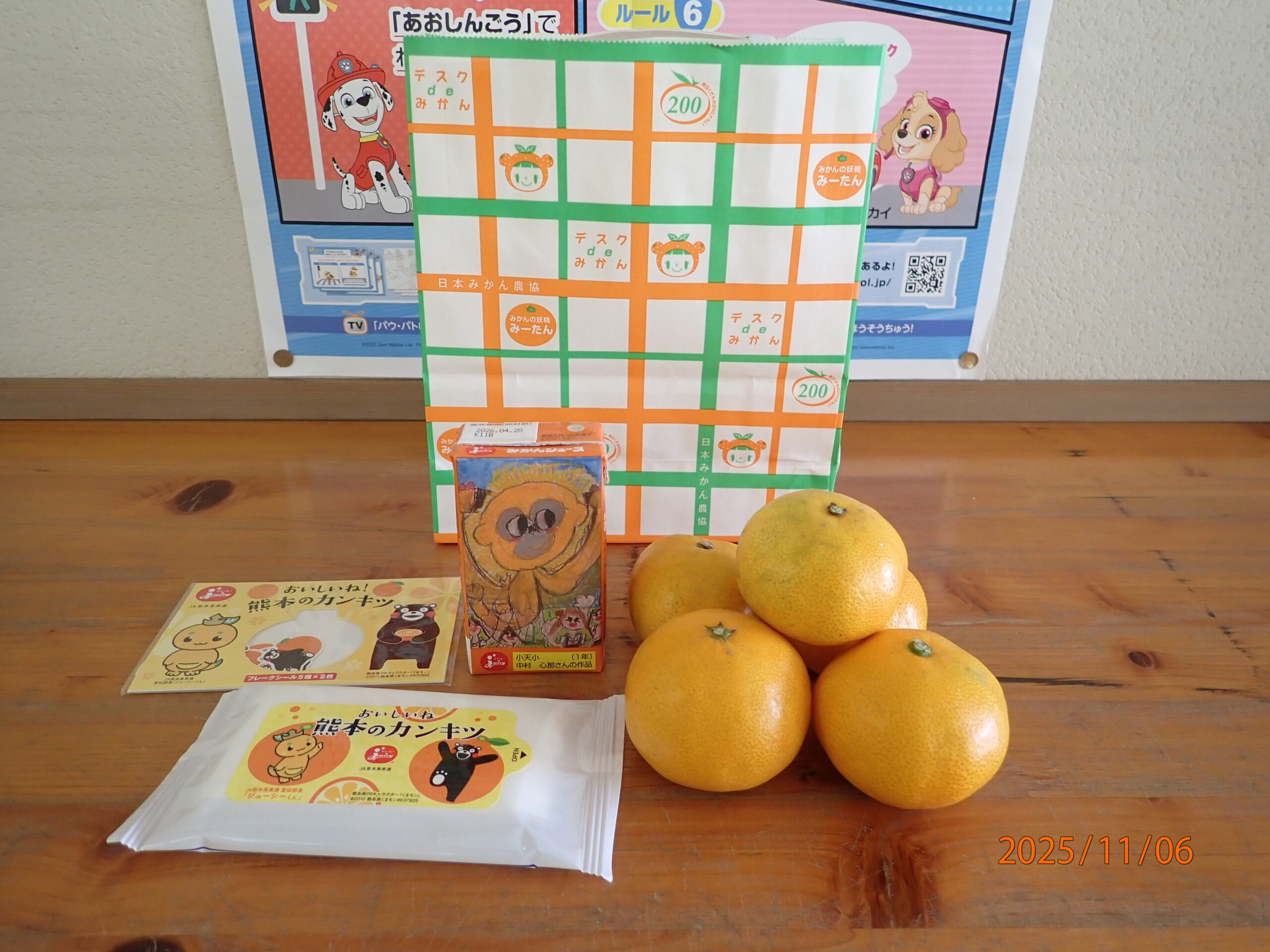 お土産にみかん・ジュース・ウエットティッシュ・シールのセットをいただきました。