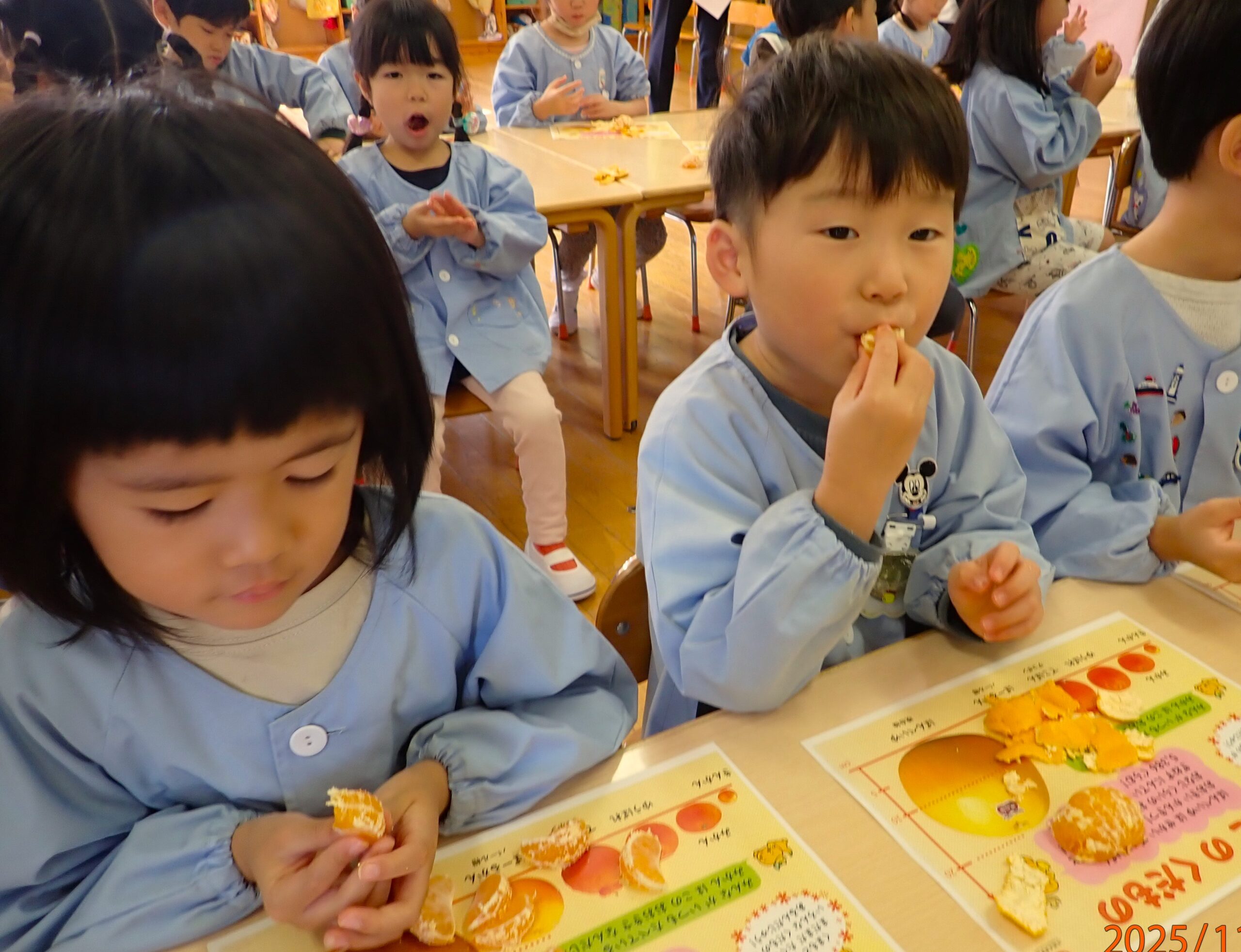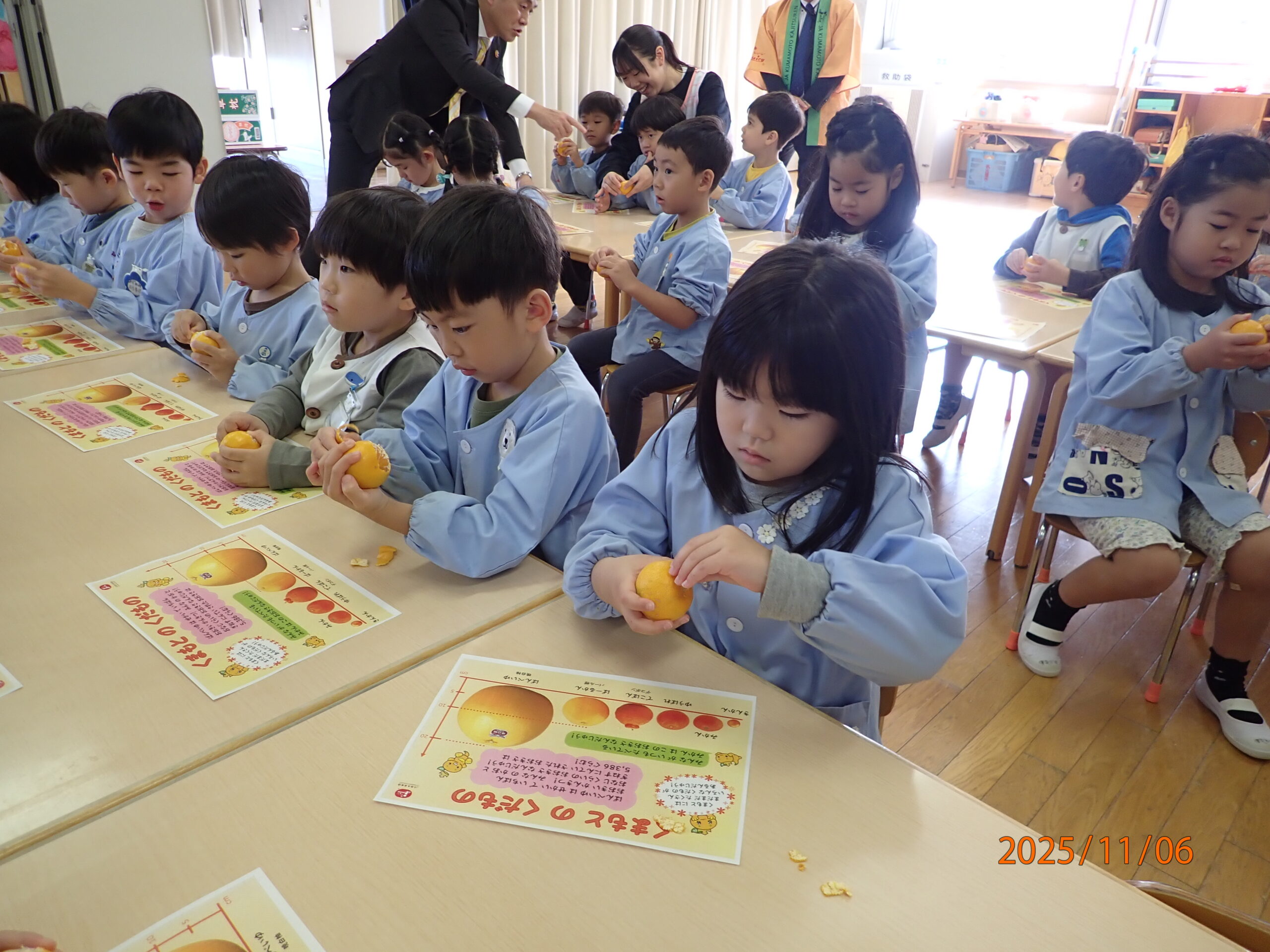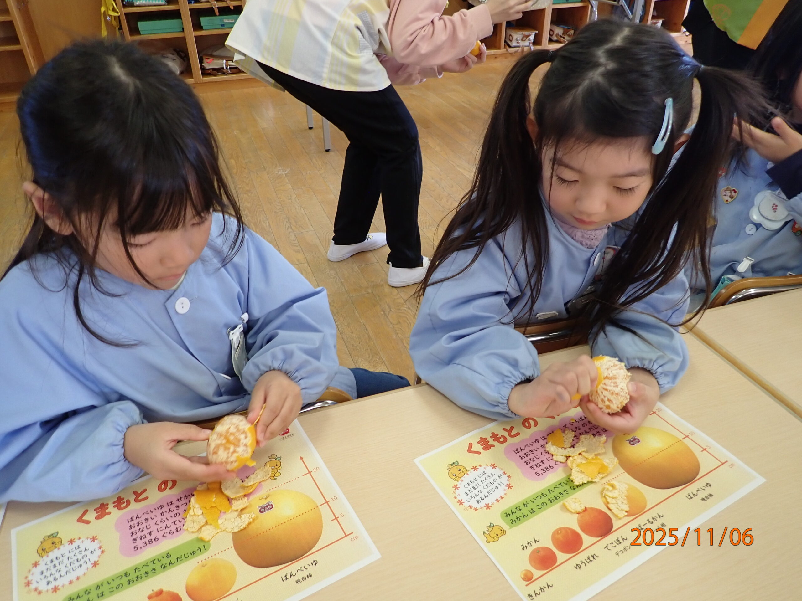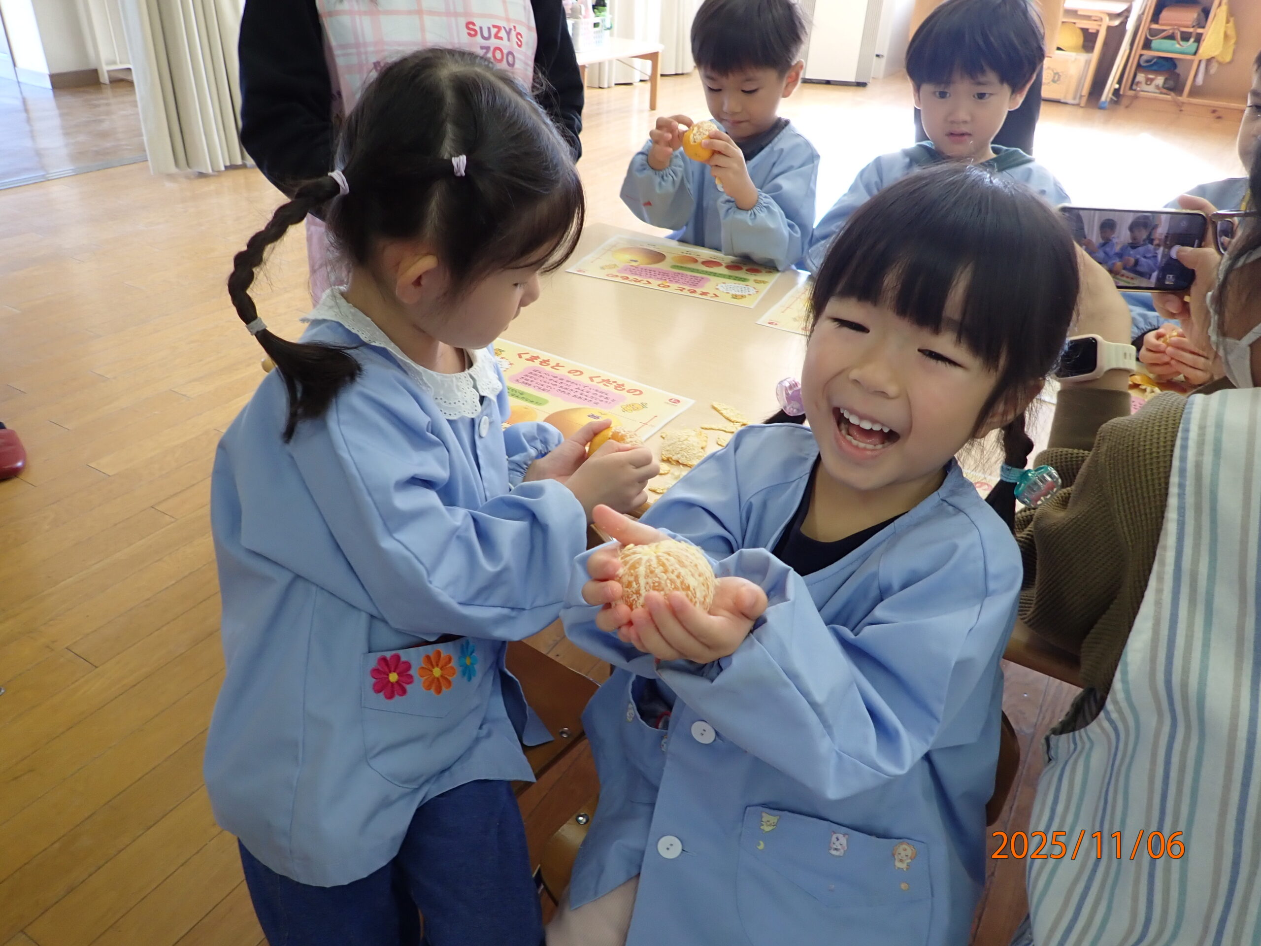 今度はみかんの皮むきです。年長さんと同じくらいみんなとっても上手にむけました。