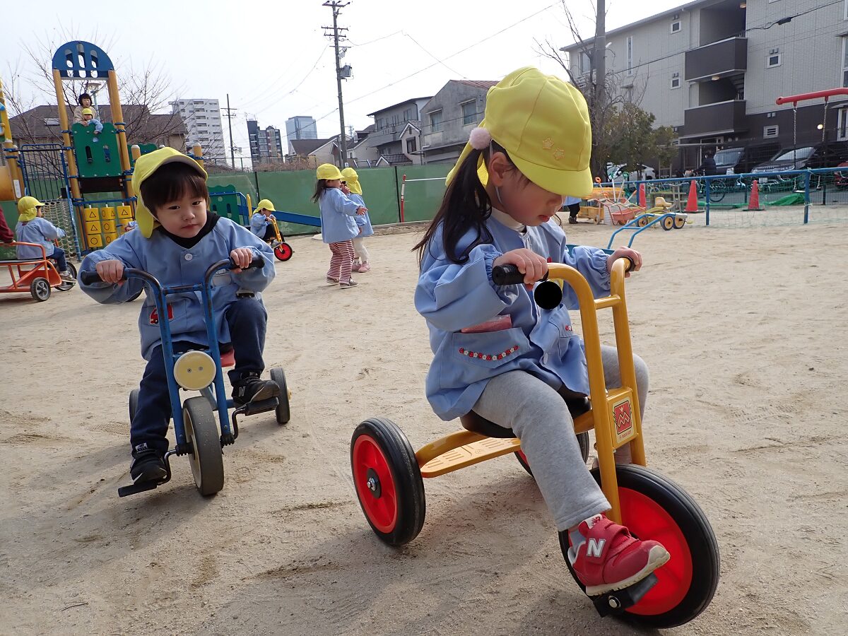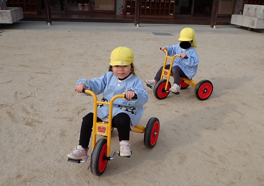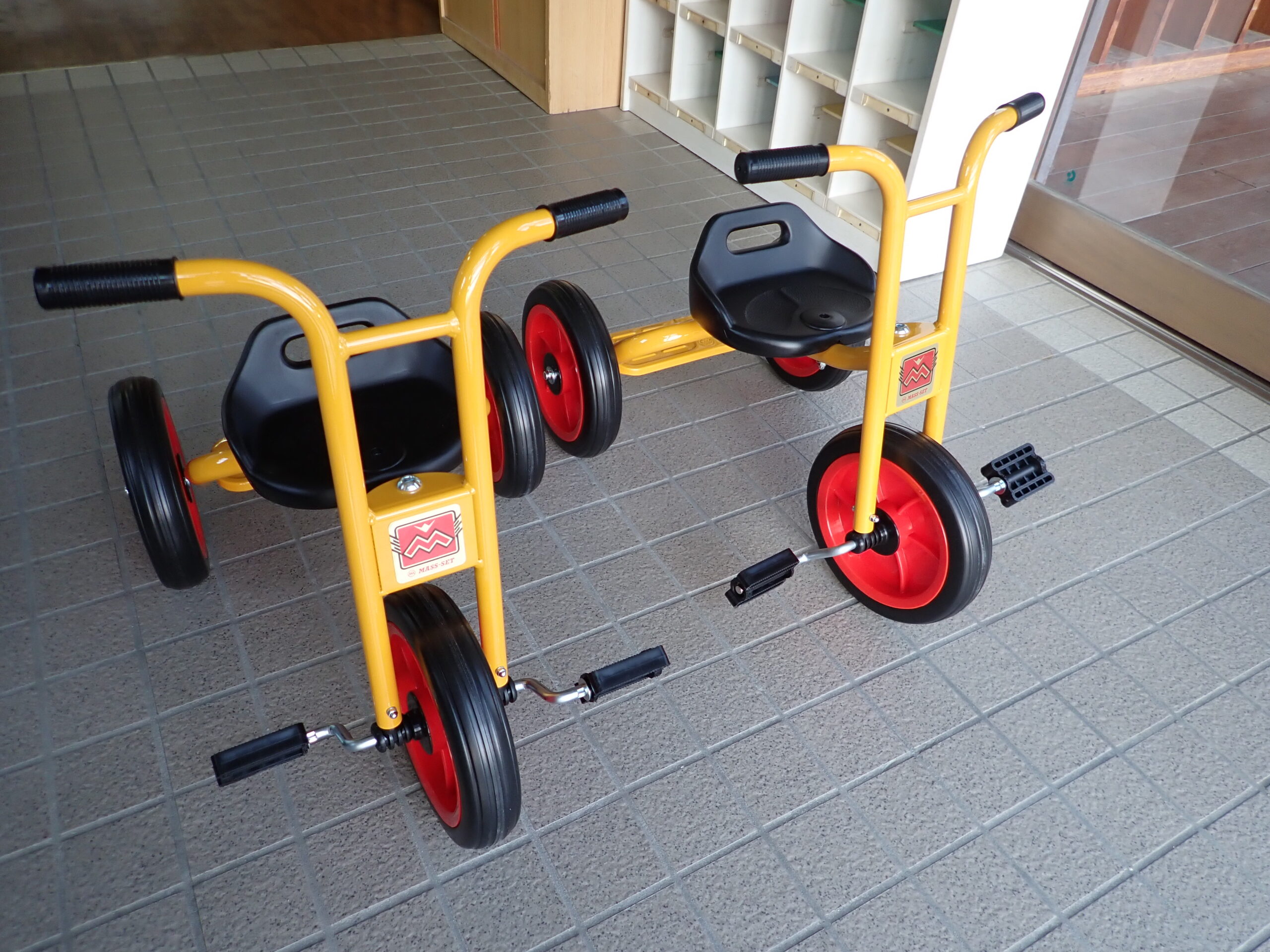 新しい三輪車を2台購入し、早速乗りこなしている子どもたち。