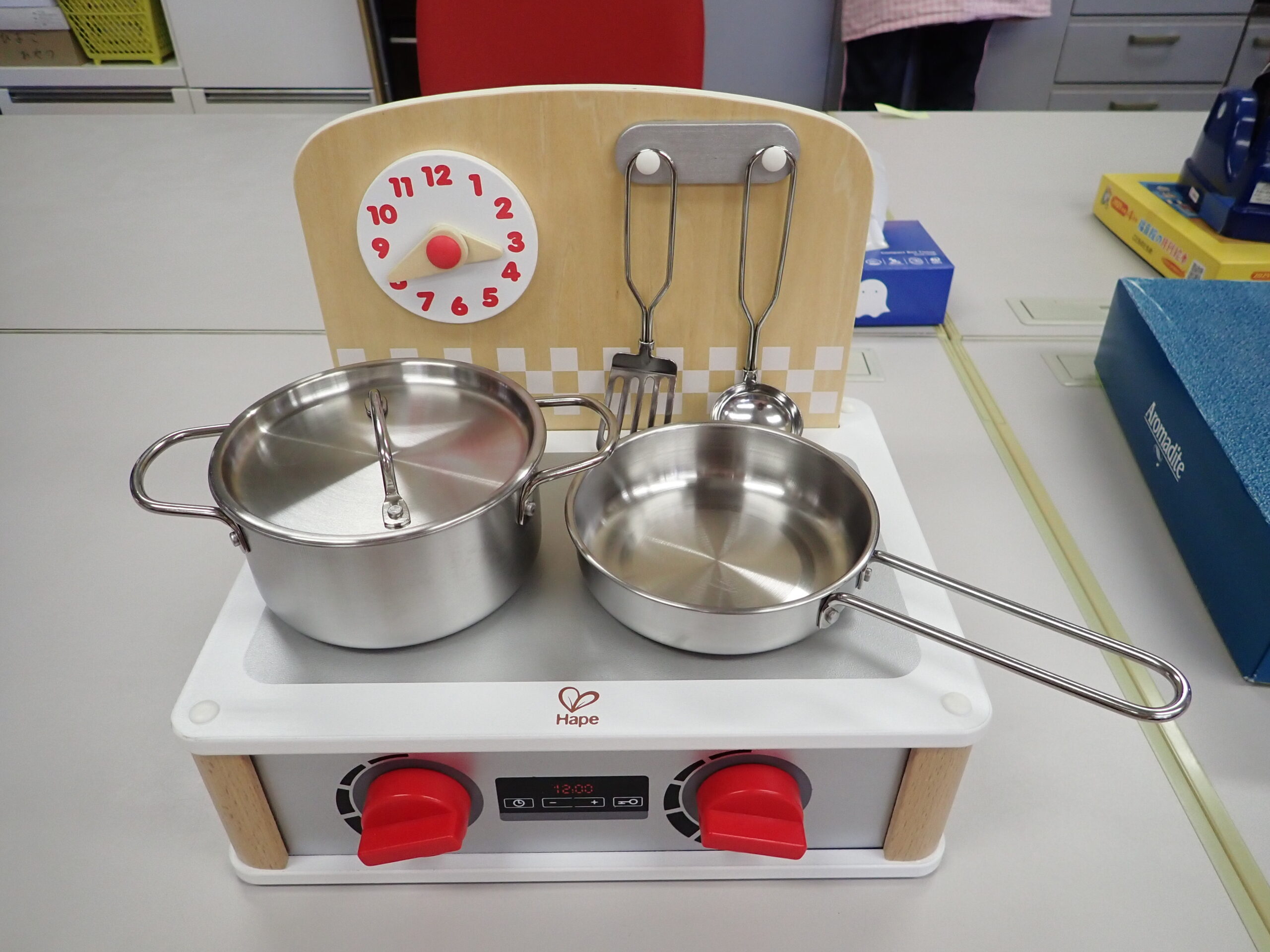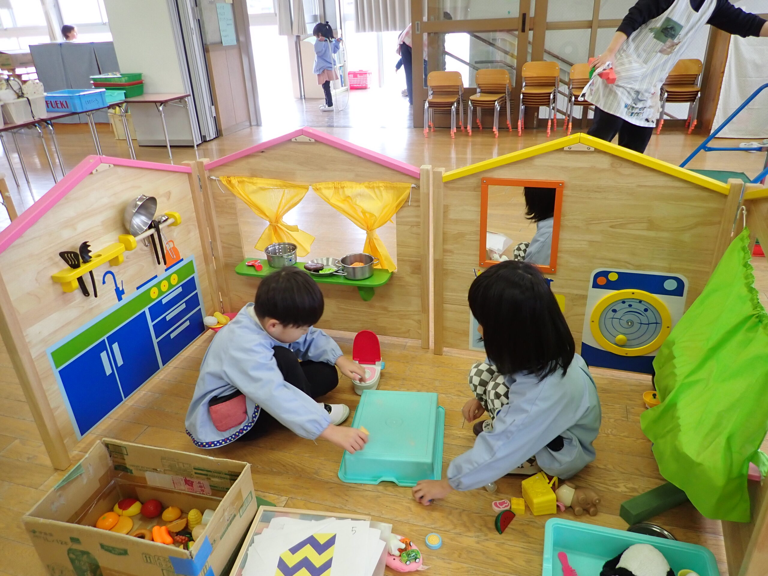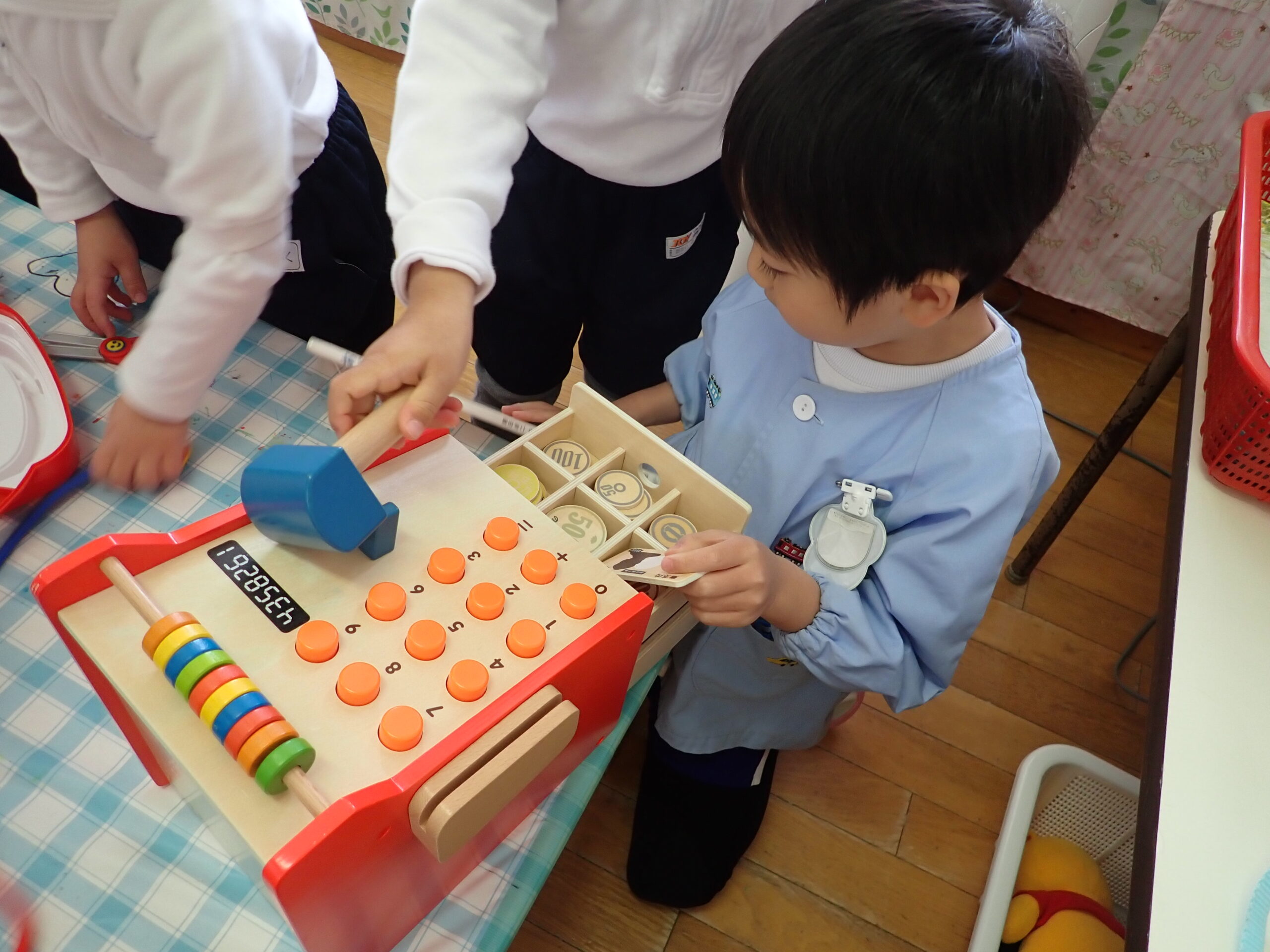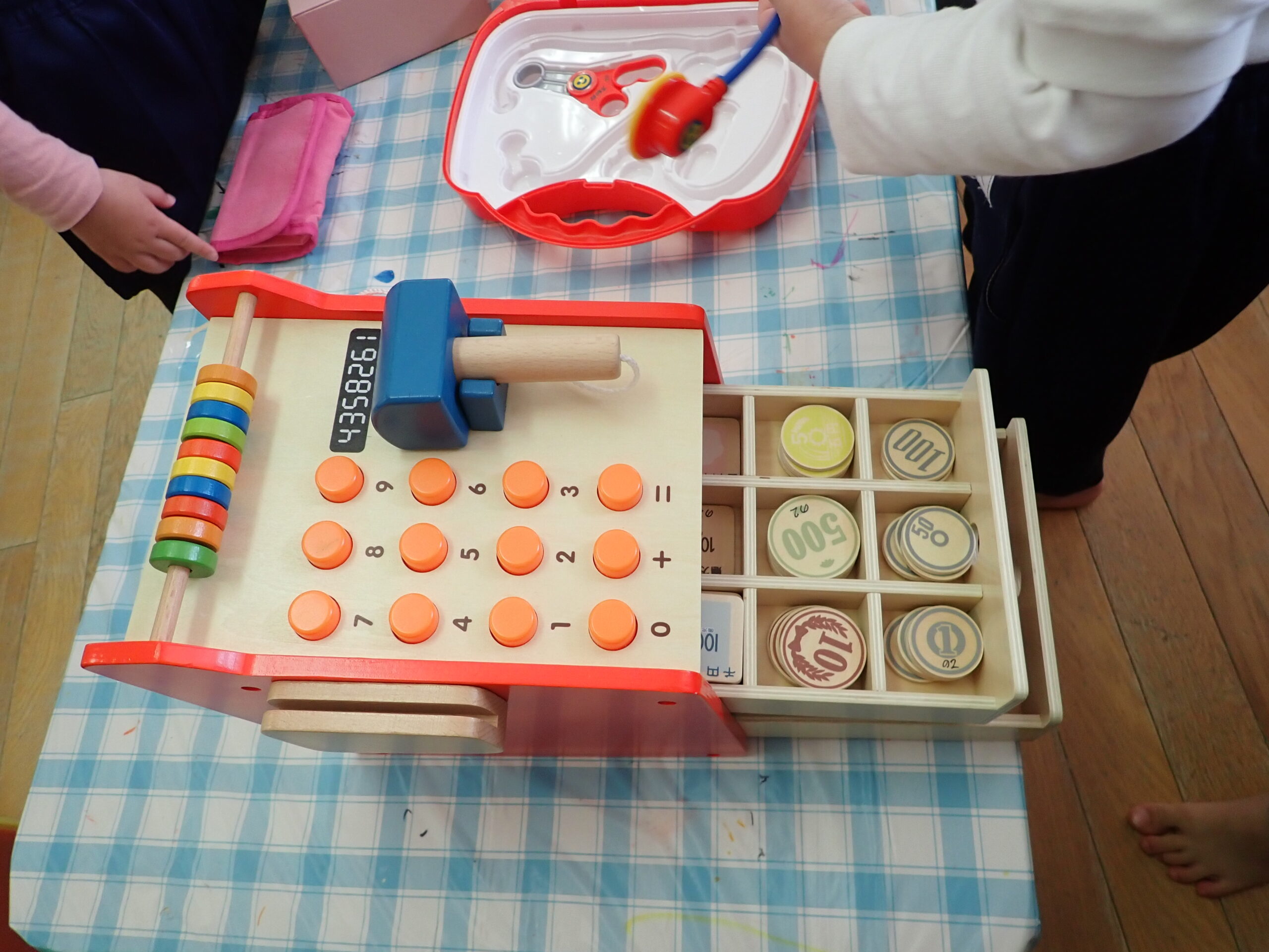 年中組にはお医者さんセットと、ままごとのガスコンロやお買い物レジが新しく入りました。