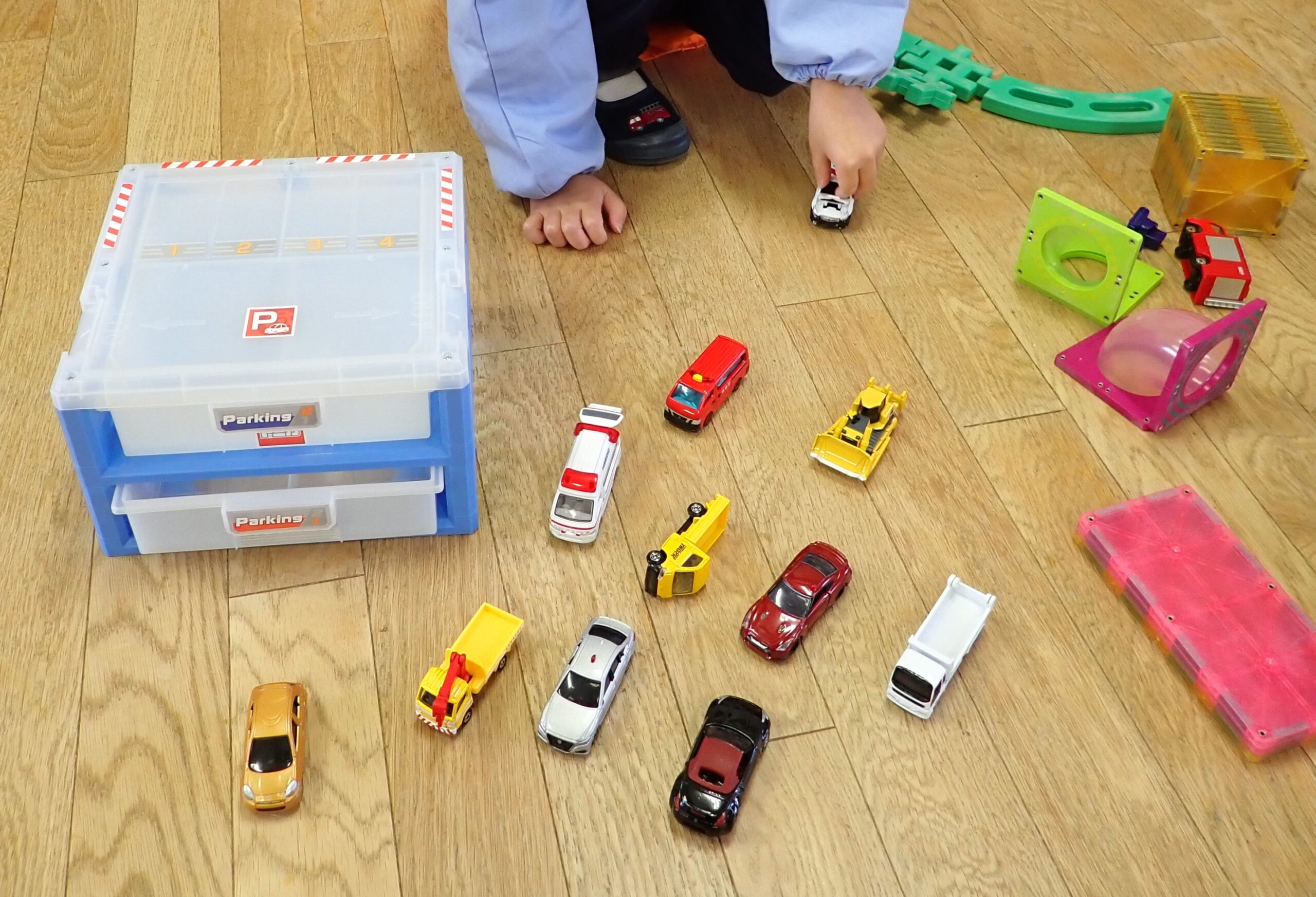 保育室にも新しいおもちゃが入りました。年少組にはトミカのシリーズが仲間入り。