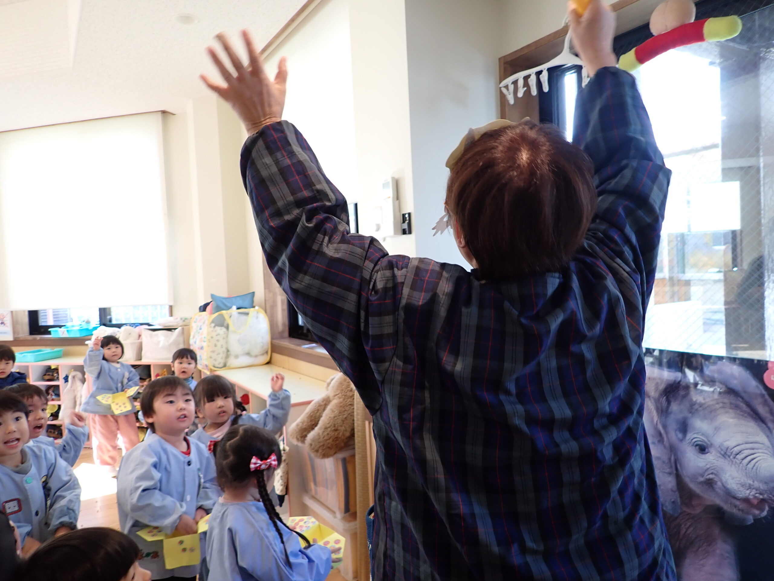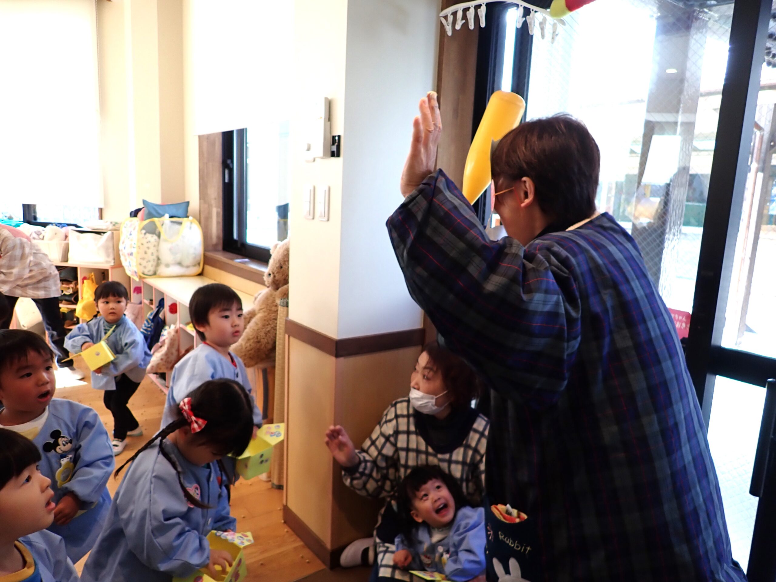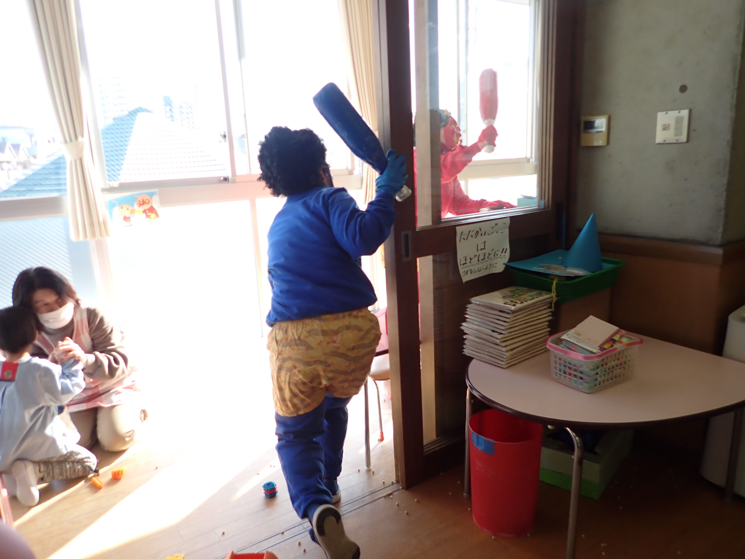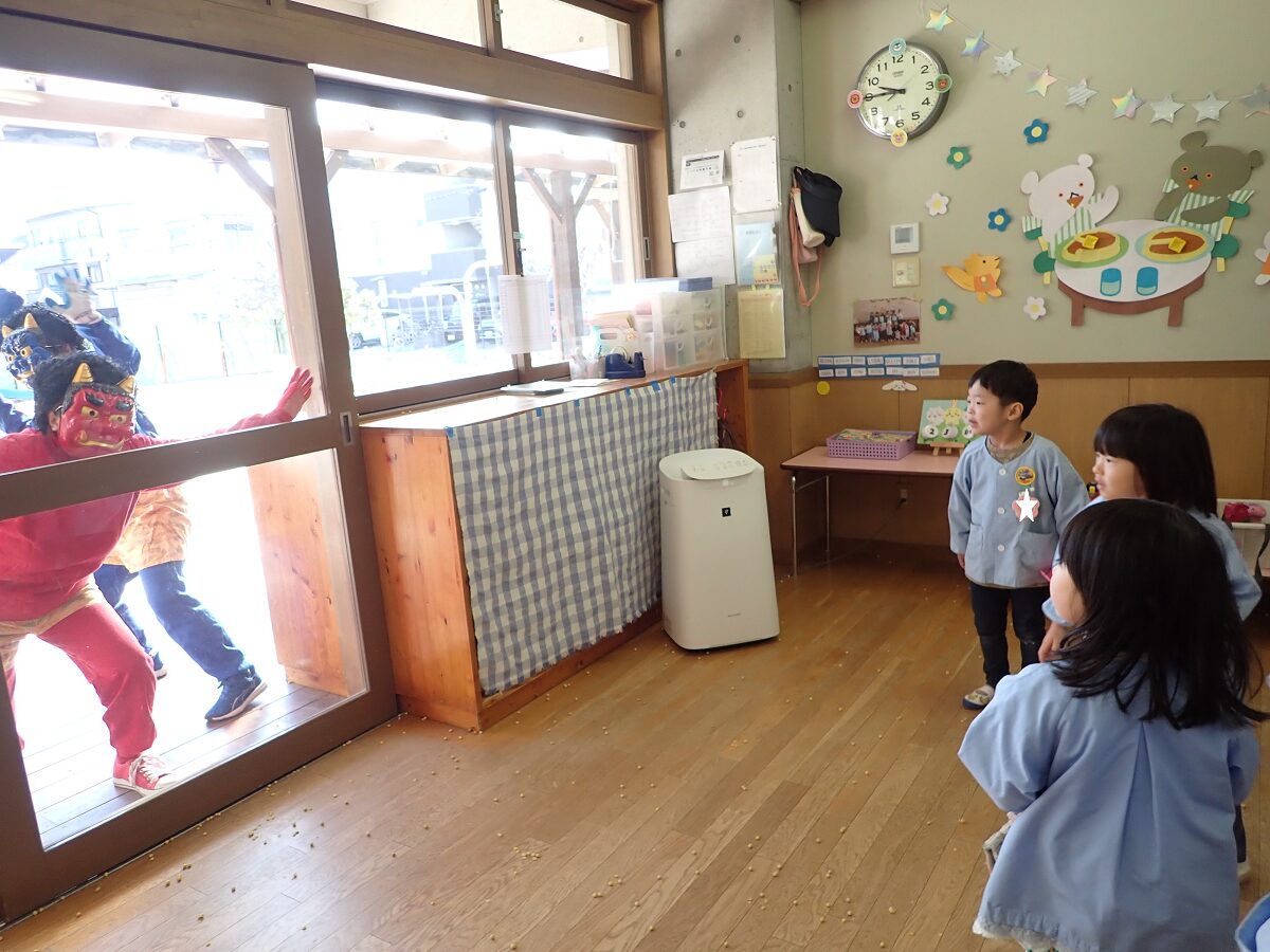 みんなが登園し、ひよこ組がお部屋の中にいると窓の外に鬼が登場!