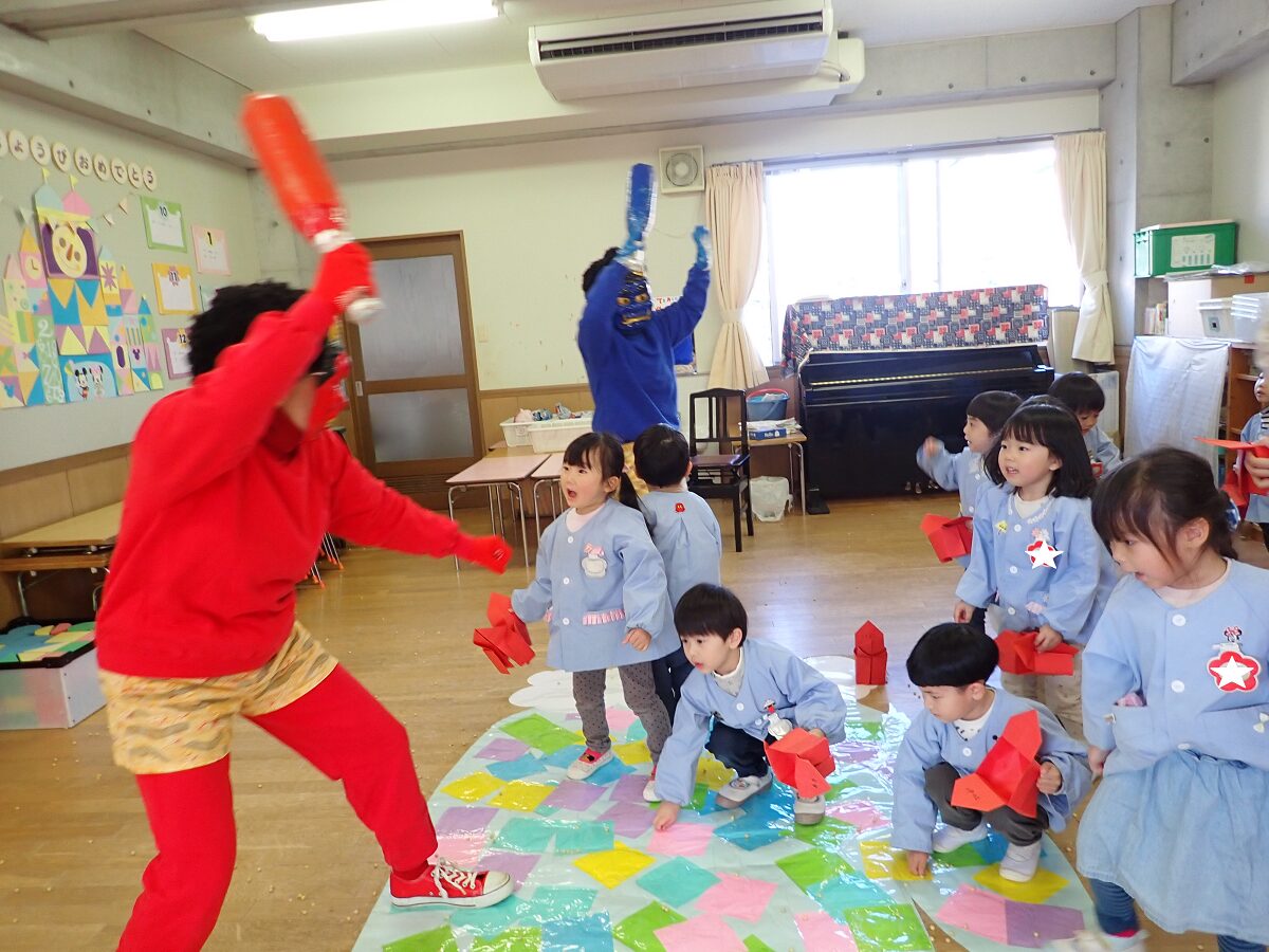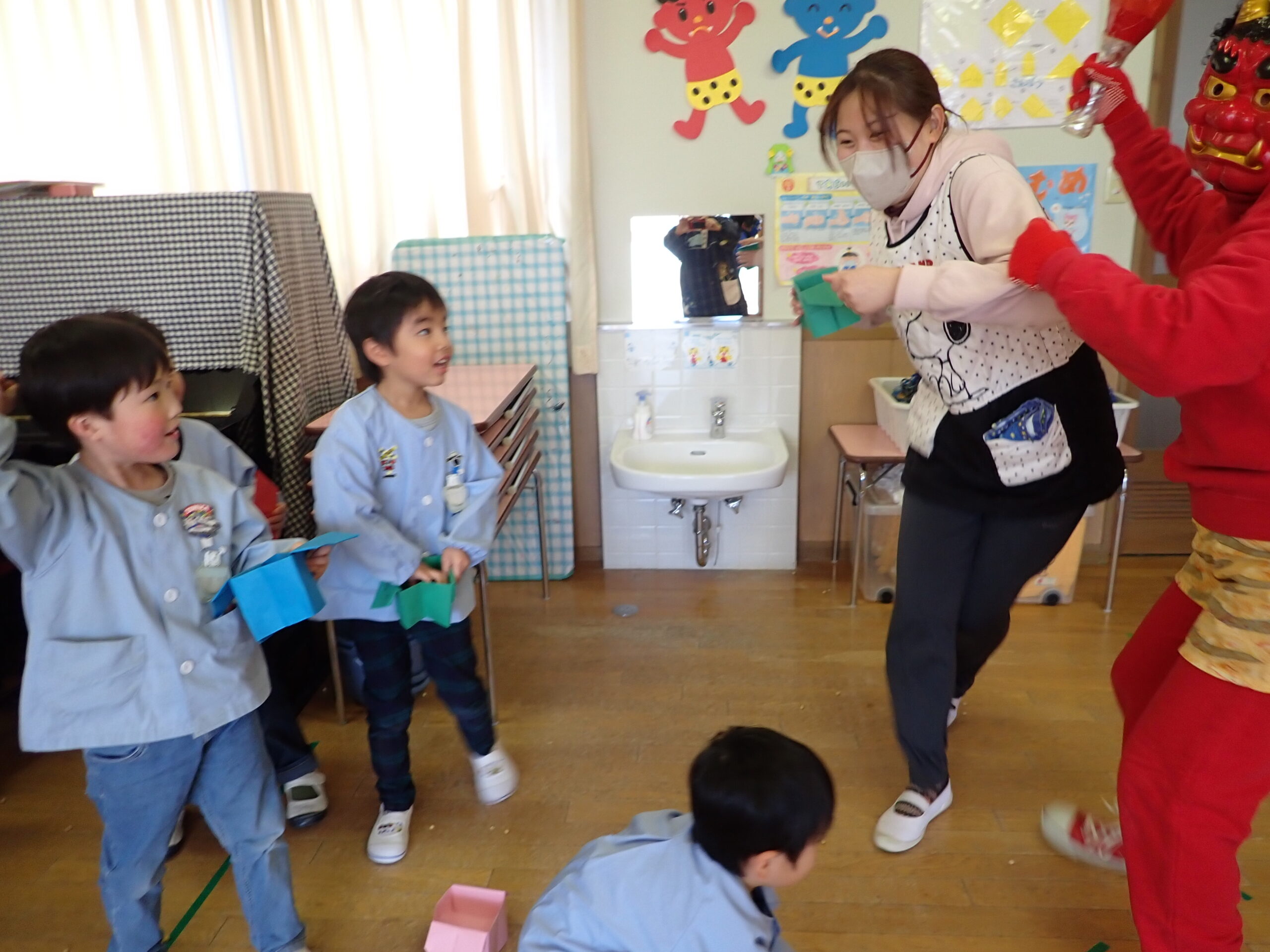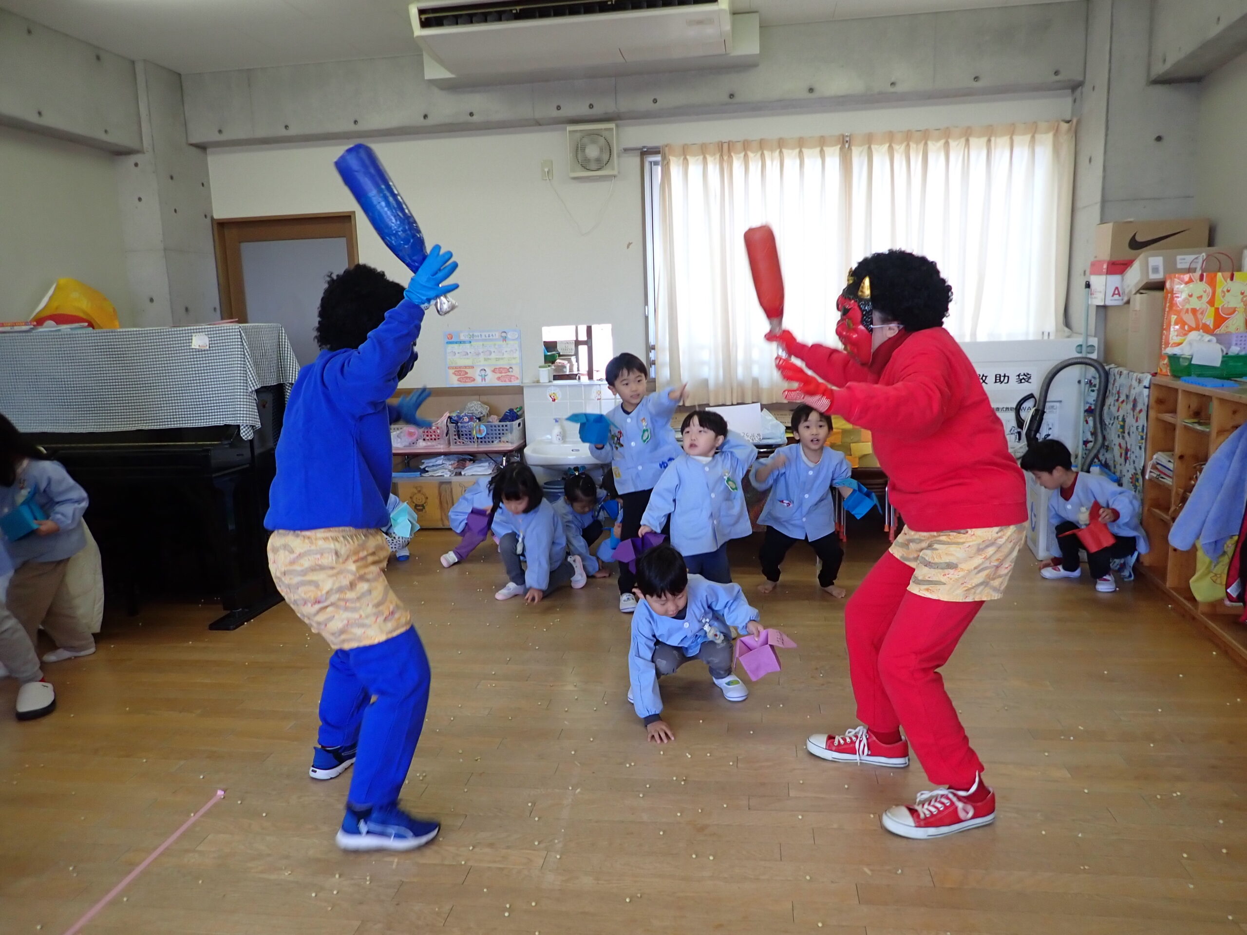 ひよこ組の豆の攻撃にやられて鬼は退散していきました👹