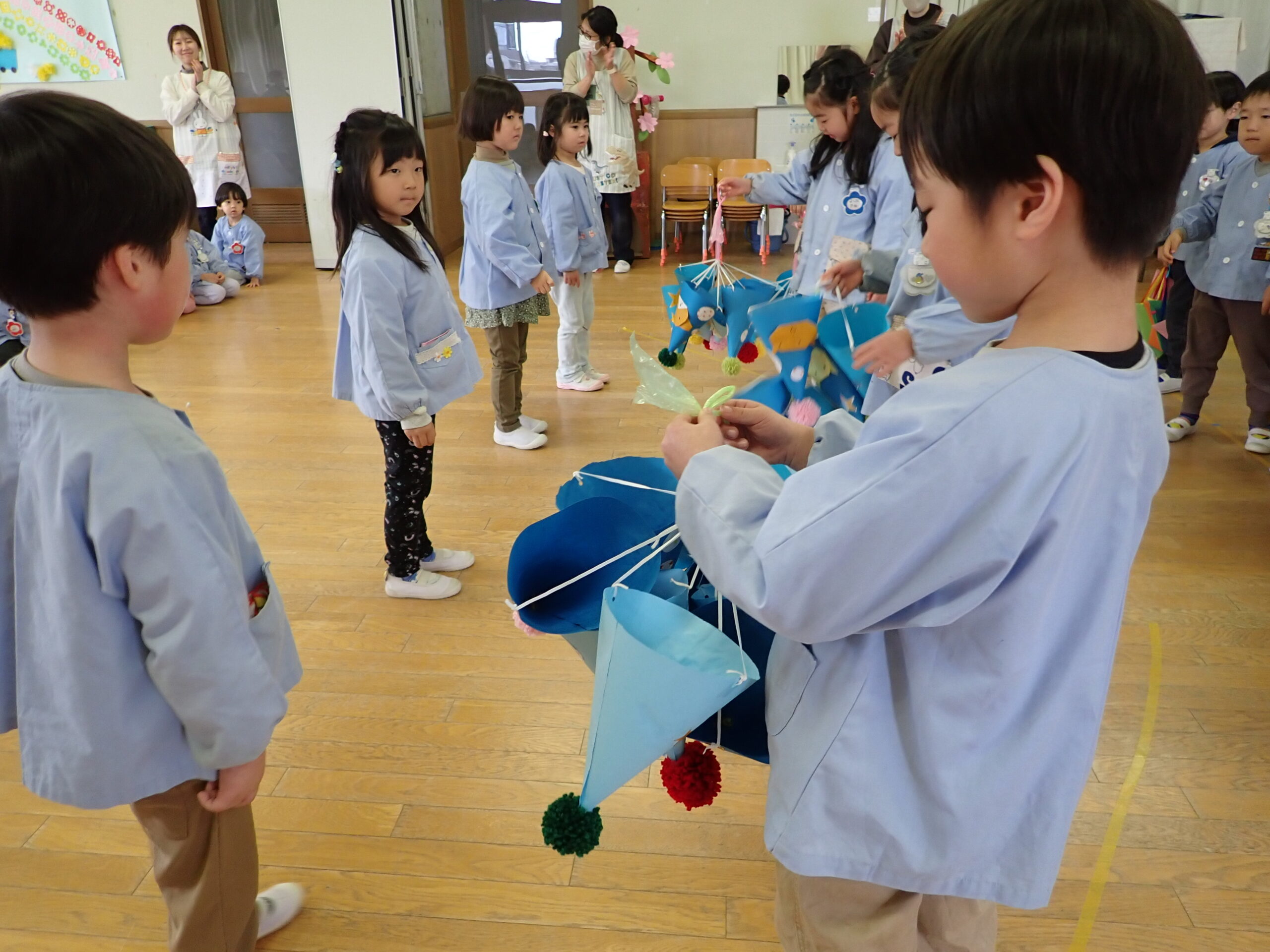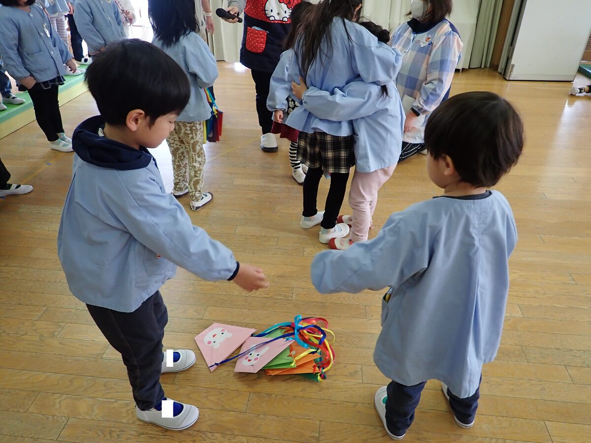 ここで小さい組から年長組にお礼のプレゼントを渡します。