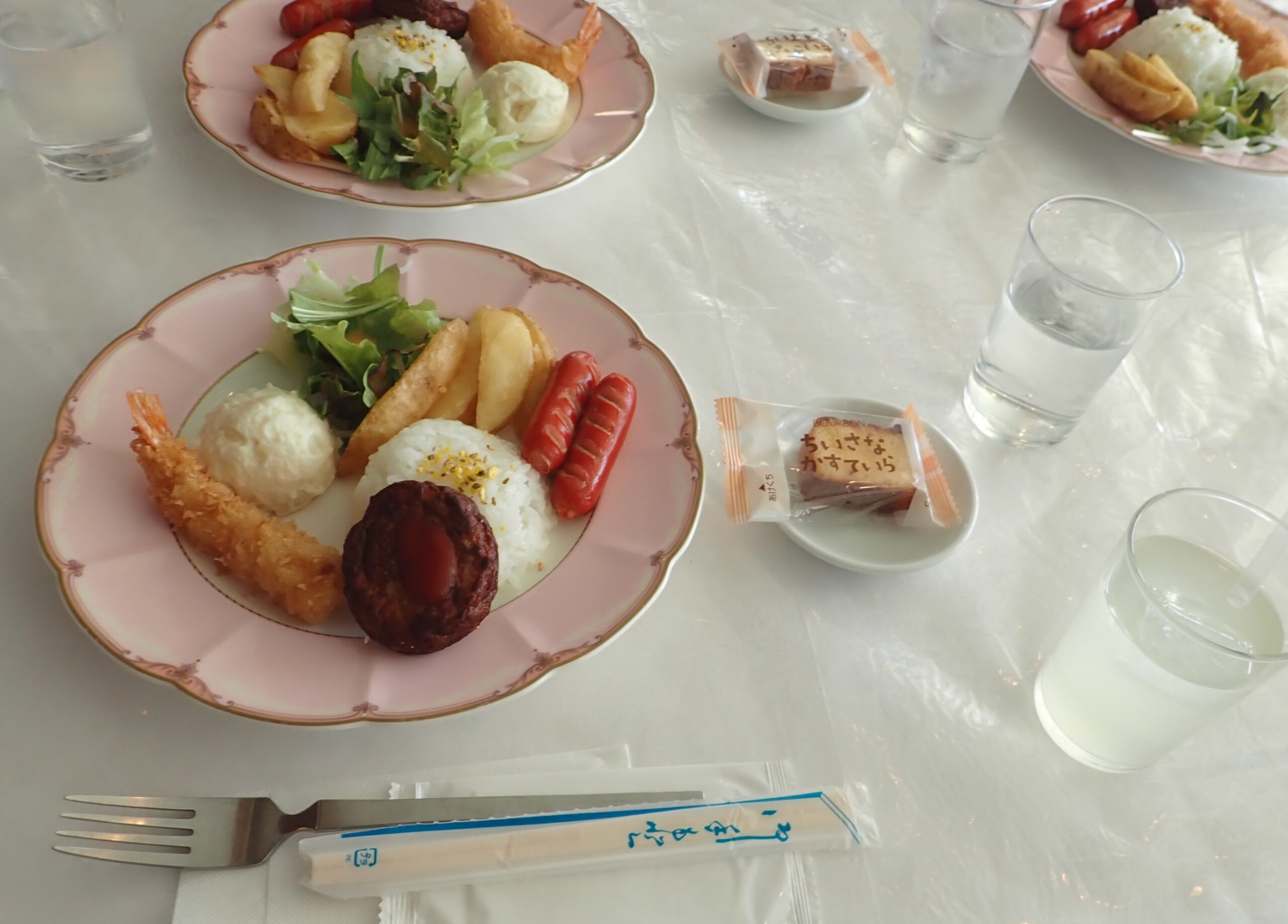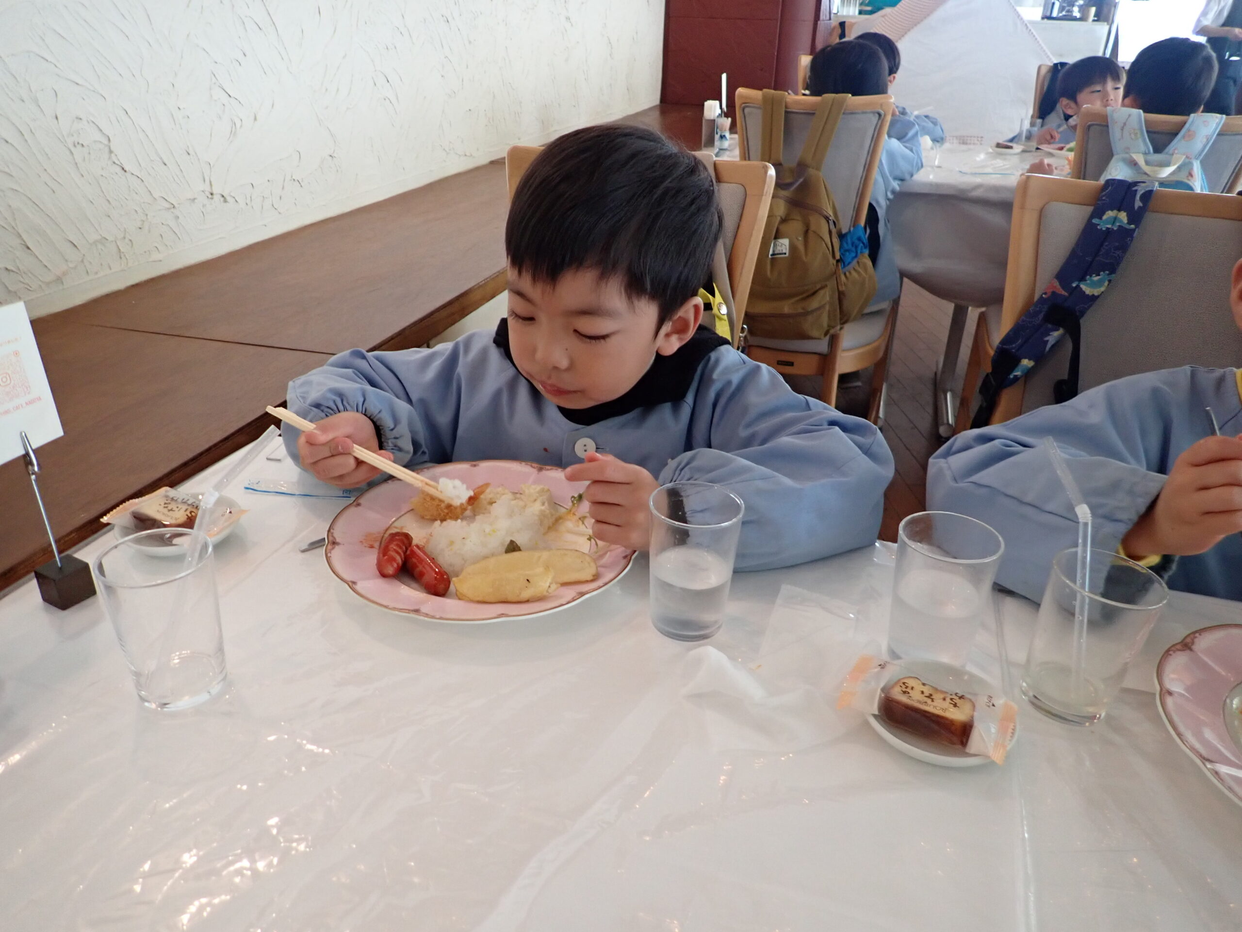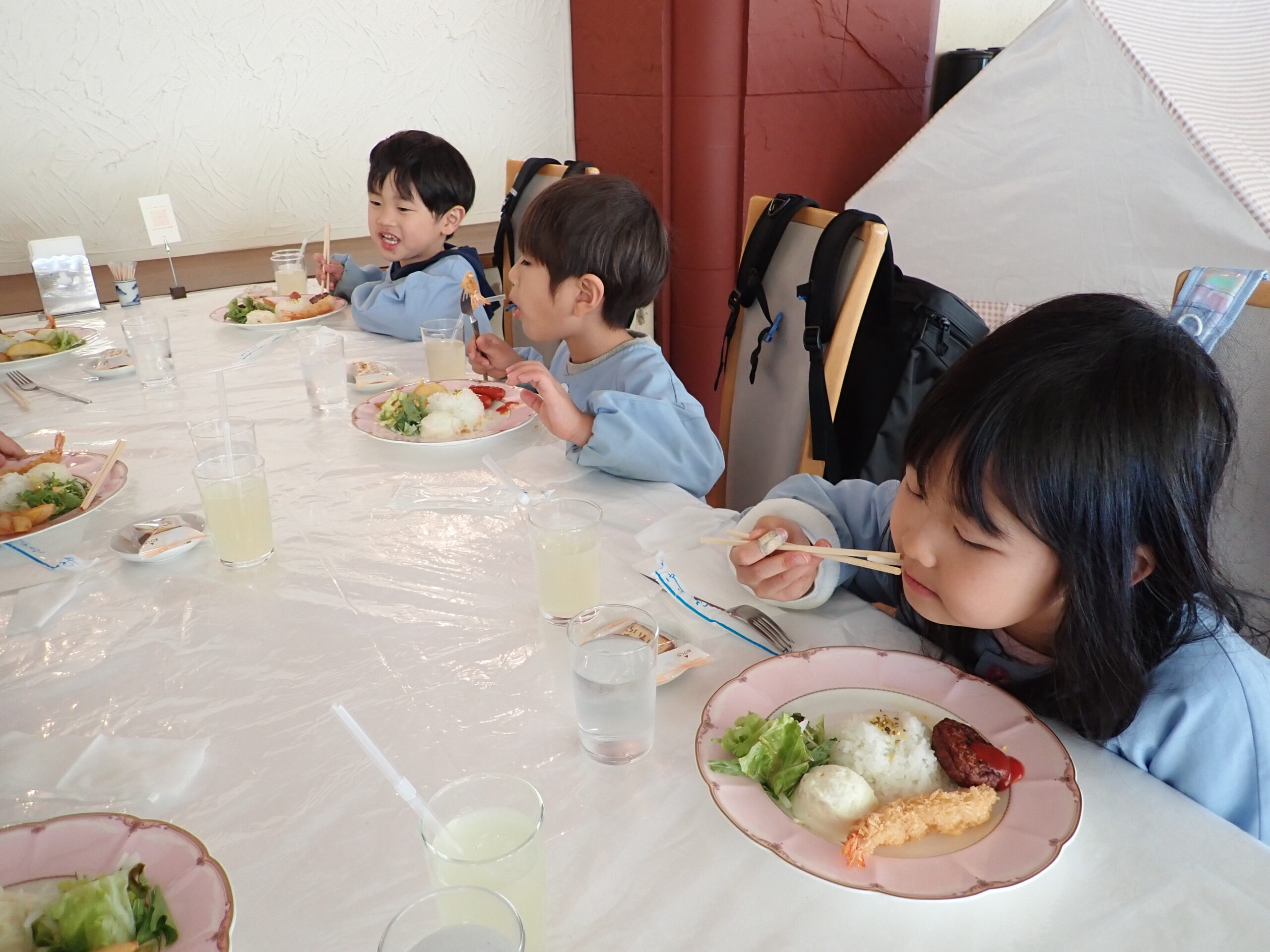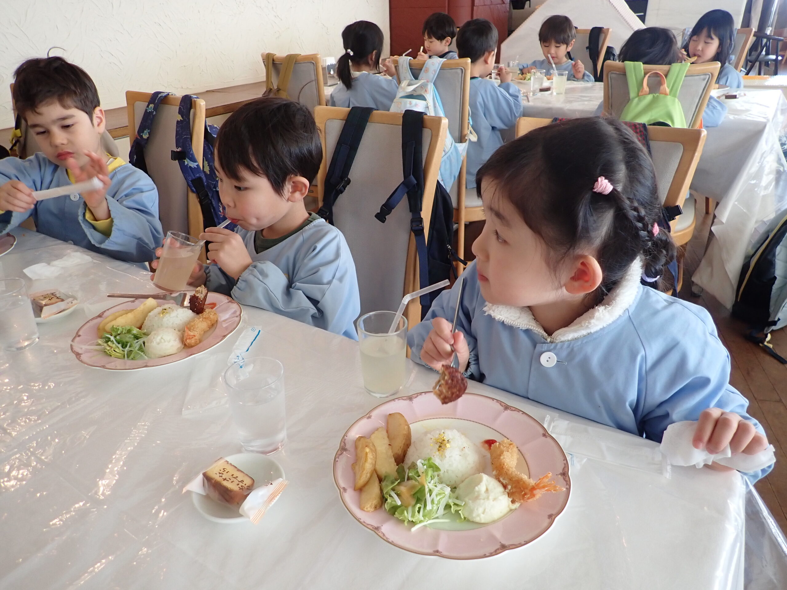 本日のメニューは、キッズプレートにリンゴジュースとカステラ付き。みんなでいただきます。