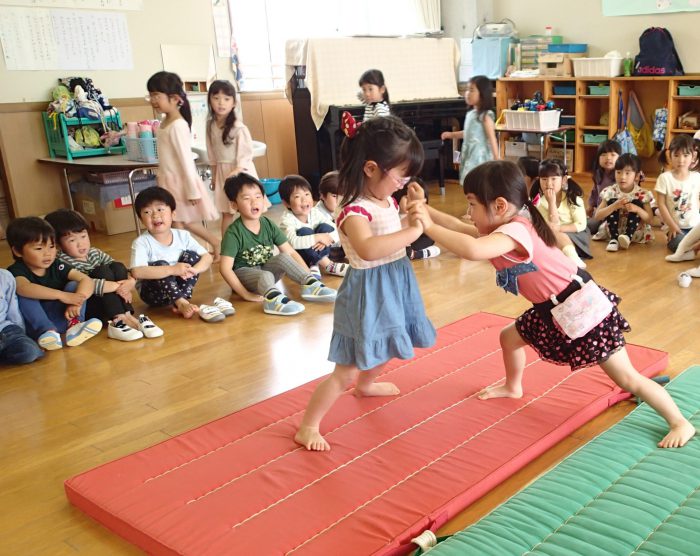 年中組と年長組は、相撲をして遊びました。マットの土俵の上で、「はっけよ~い のこった!!」
